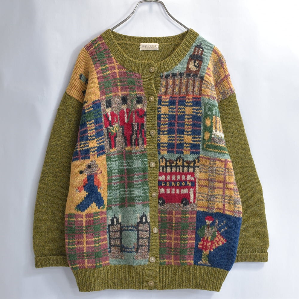 観光地やタータンチェック柄がパッチワーク風に編まれたデザインのニットカーディガンです
