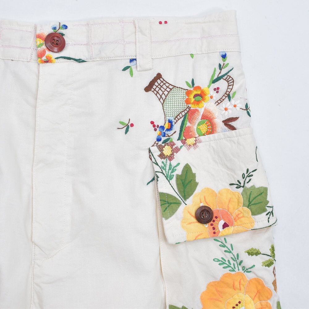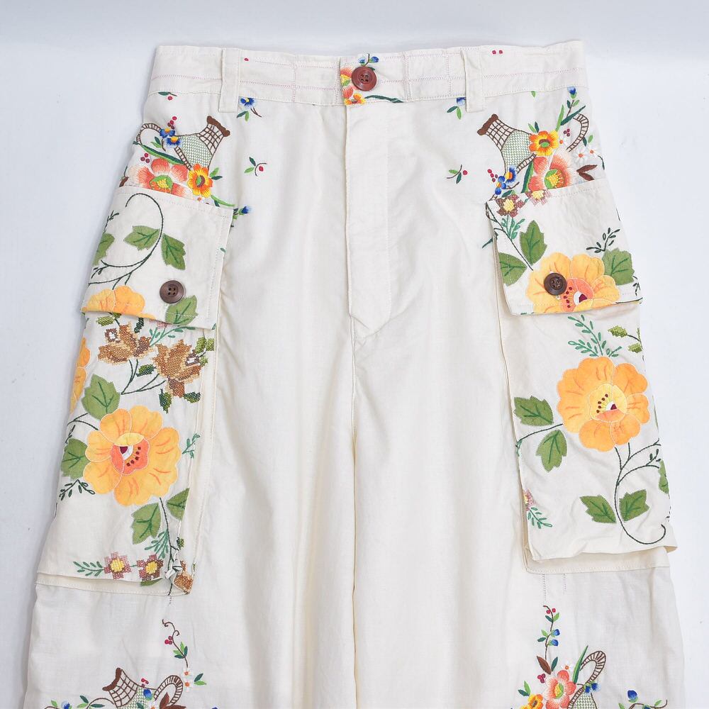 可愛らしいお花が描かれた刺繍生地をボトムスに再構築したリメイクパンツ