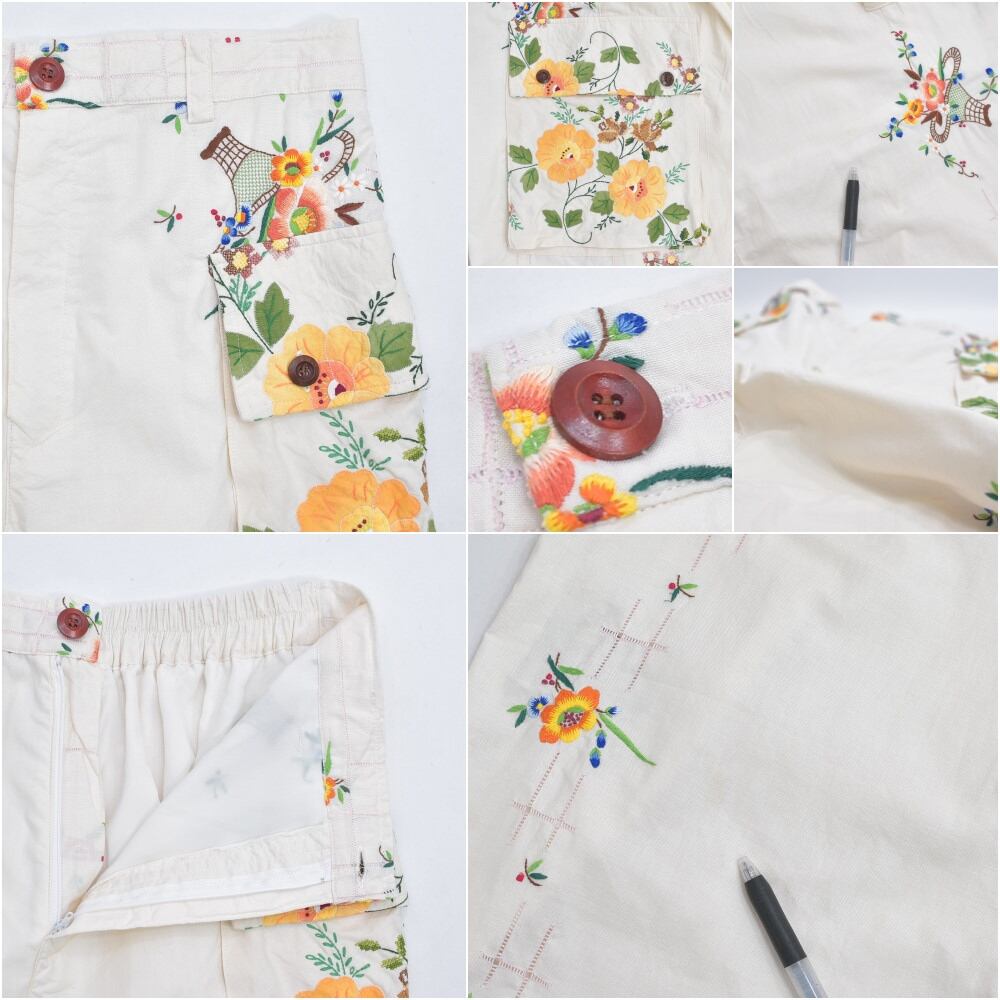 Remakeリメイク 再構築 パッチワーク&フラワー刺繍 デザイン ワイドシルエット コットン カーゴパンツ バギー アイボリー 古着 裏地付き レディースW70~88cm