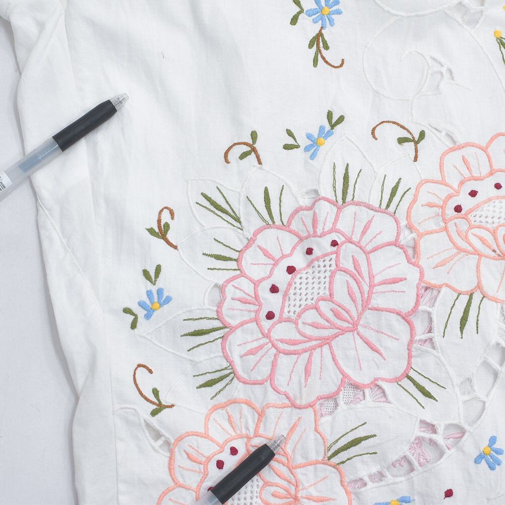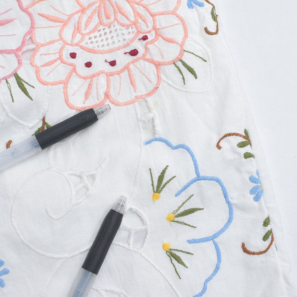 可愛らしいお花が描かれた刺繍クロスの生地をボトムスに再構築したパッチワークのリメイクパンツ