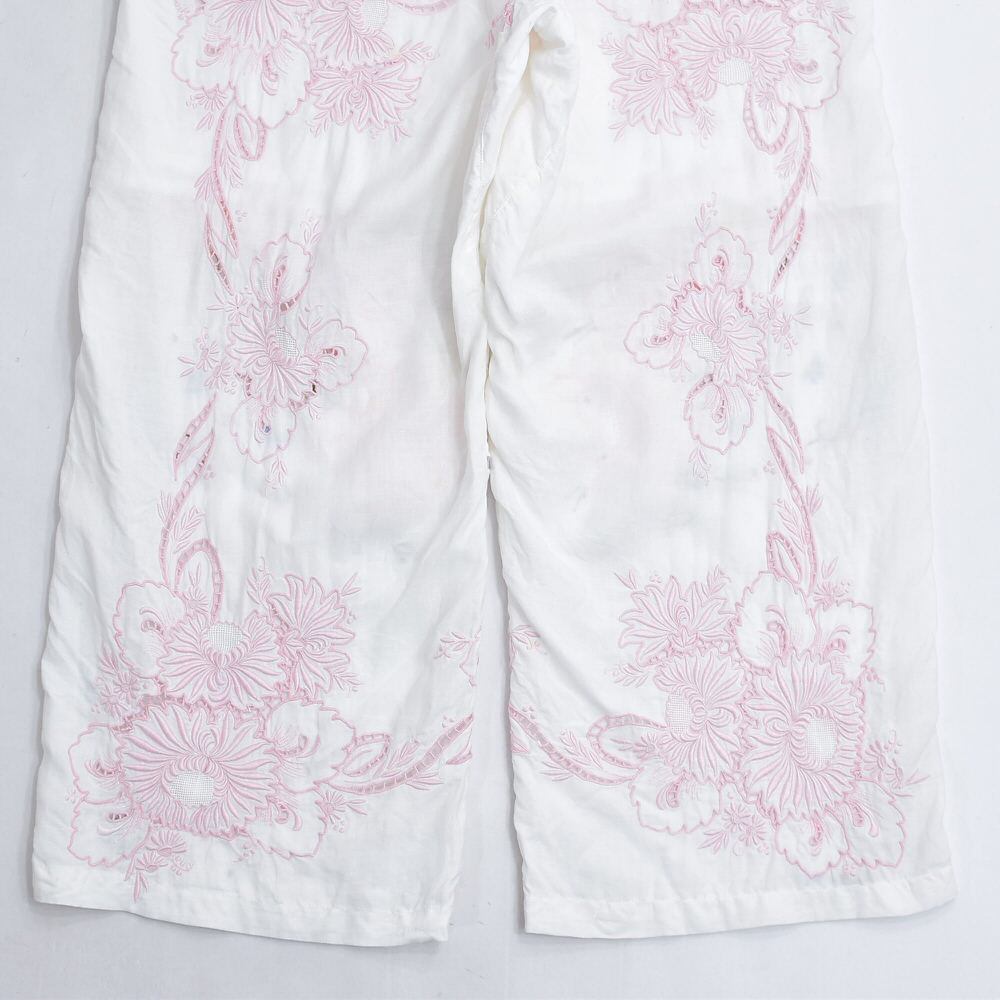 Remakeリメイク 再構築 パッチワーク&フラワー刺繍 デザイン ルーズシルエット イージーパンツ ホワイト 古着 裏地付き レディースW 70〜108cm
