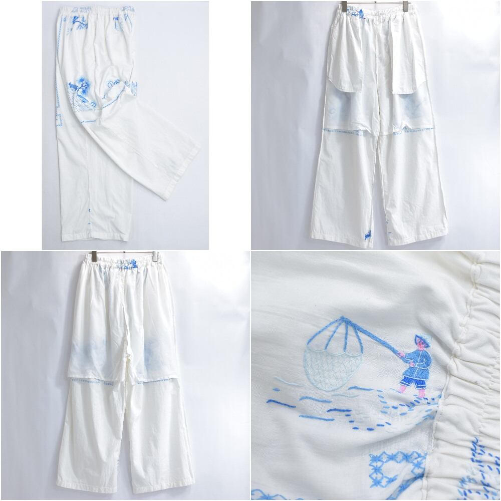 Remakeリメイク 再構築 パッチワーク&フラワー刺繍 デザイン ルーズシルエット イージーパンツ ホワイト 古着 裏地付き レディースW 70~108cm