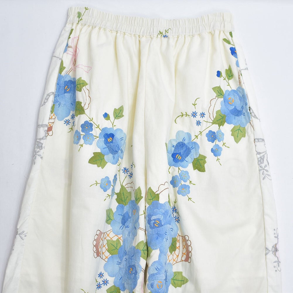 可愛らしいお花が描かれた刺繍クロスの生地をボトムスに再構築したパッチワークのリメイクパンツ