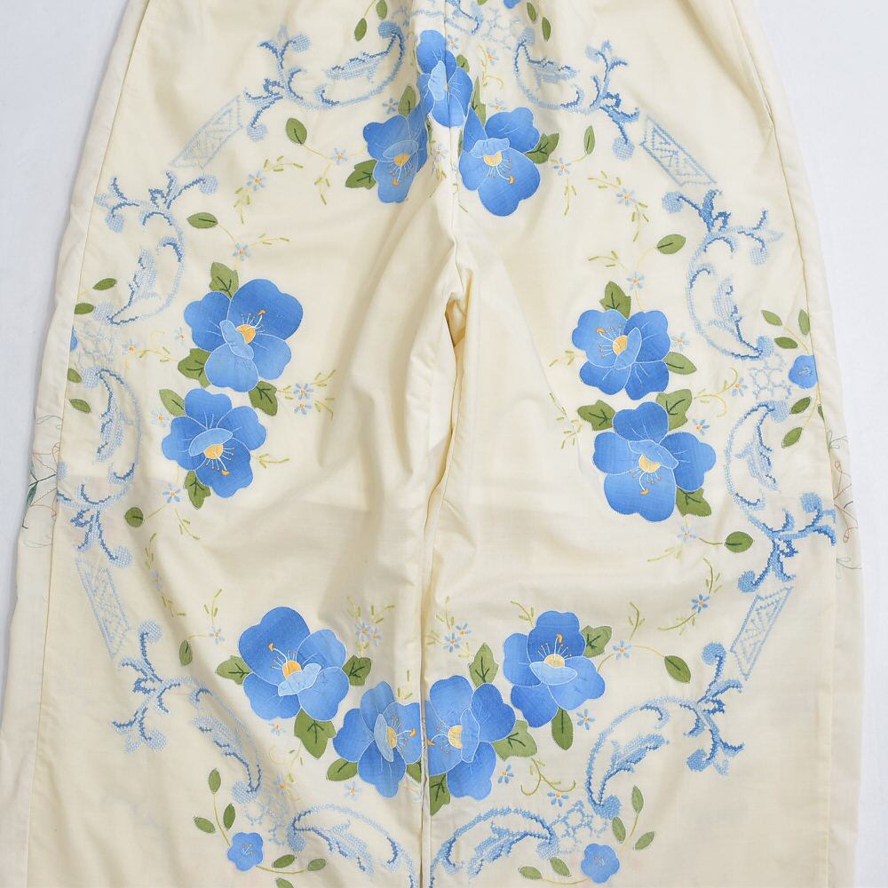 可愛らしいお花が描かれた刺繍クロスの生地をボトムスに再構築したパッチワークのリメイクパンツ