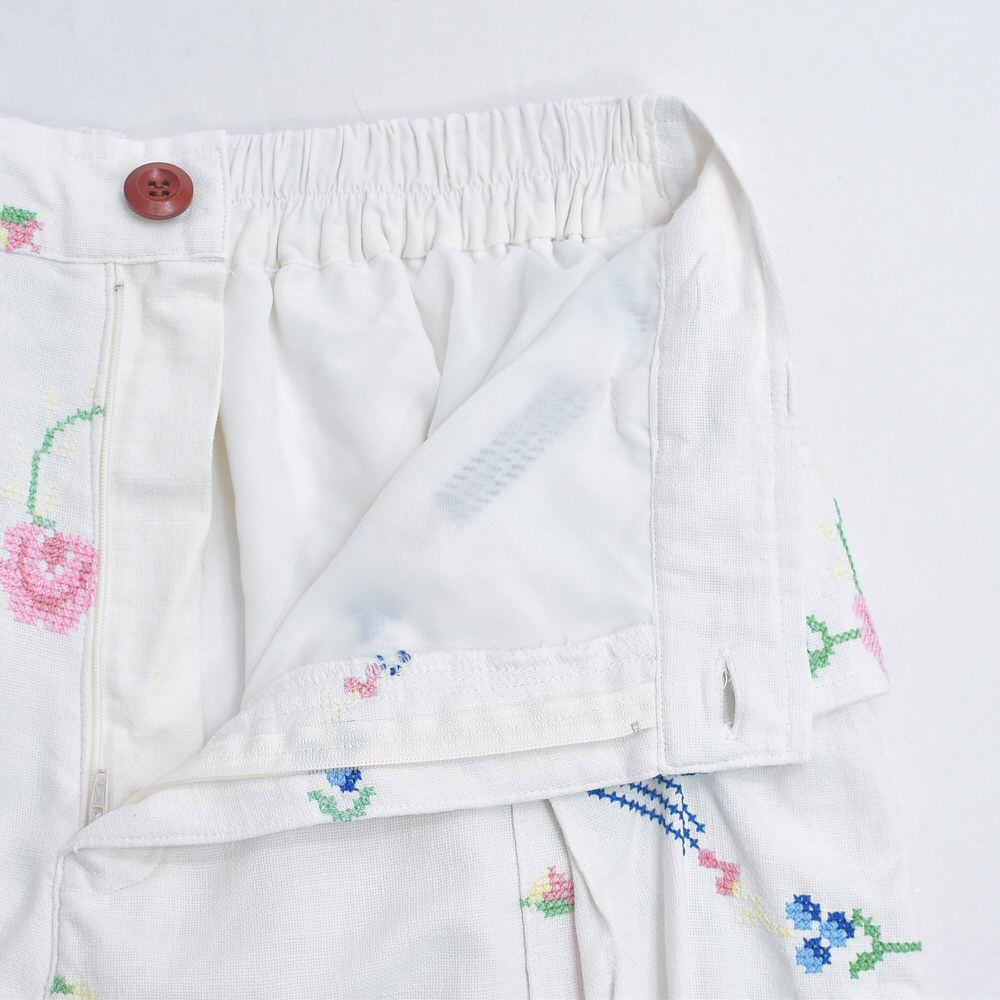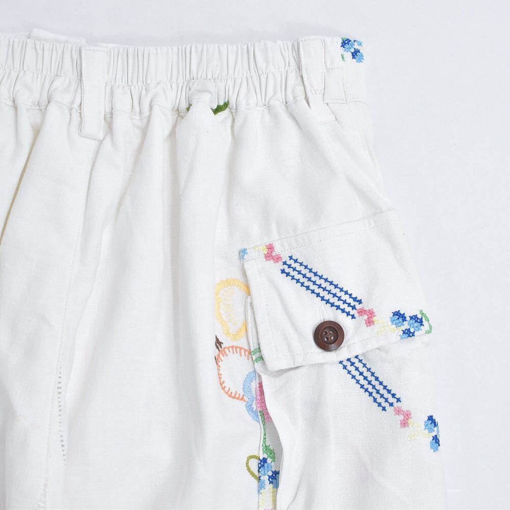 Remakeリメイク 再構築 パッチワーク&フラワー刺繍 デザイン ワイドシルエット コットン リネン カーゴパンツ バギー ホワイト古着 裏地付き レディースW72〜86cm