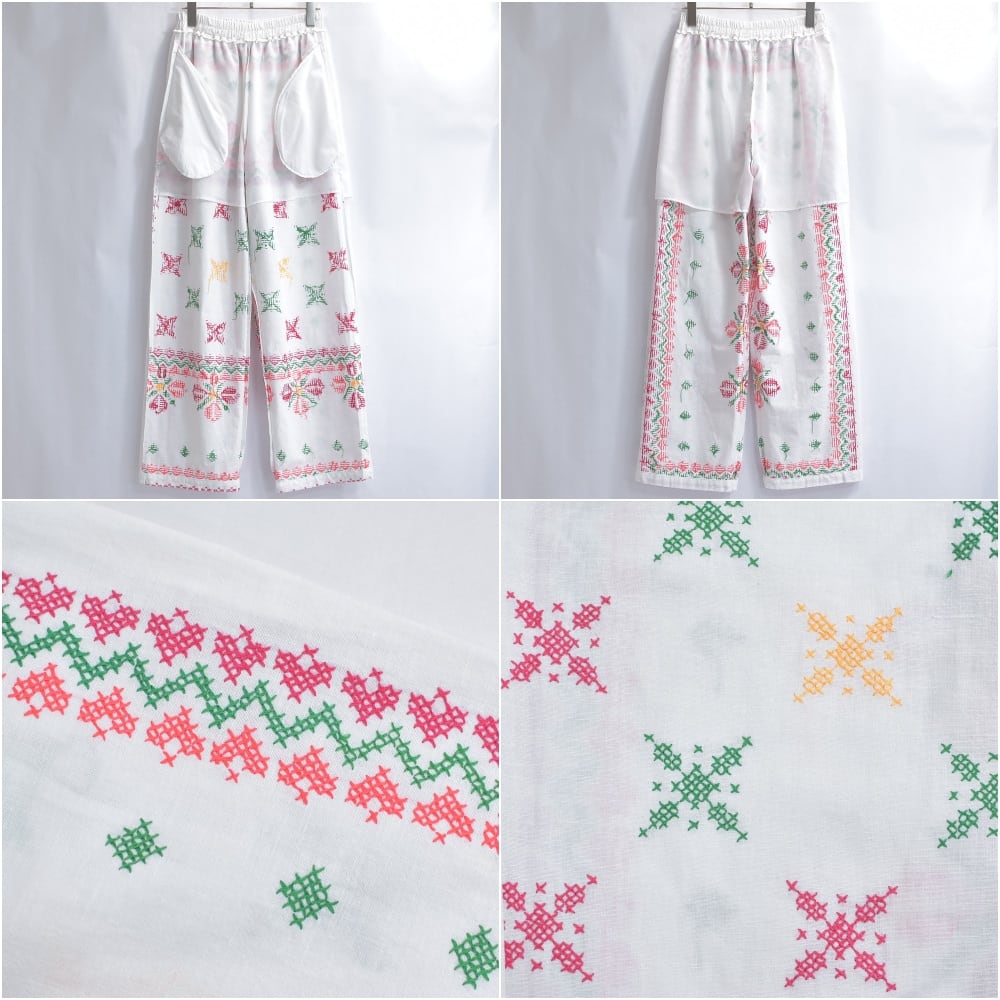 幾何学的な可愛らしいお花の模様が描かれた刺繍クロスの生地をボトムスに再構築したパッチワークのリメイクパンツ