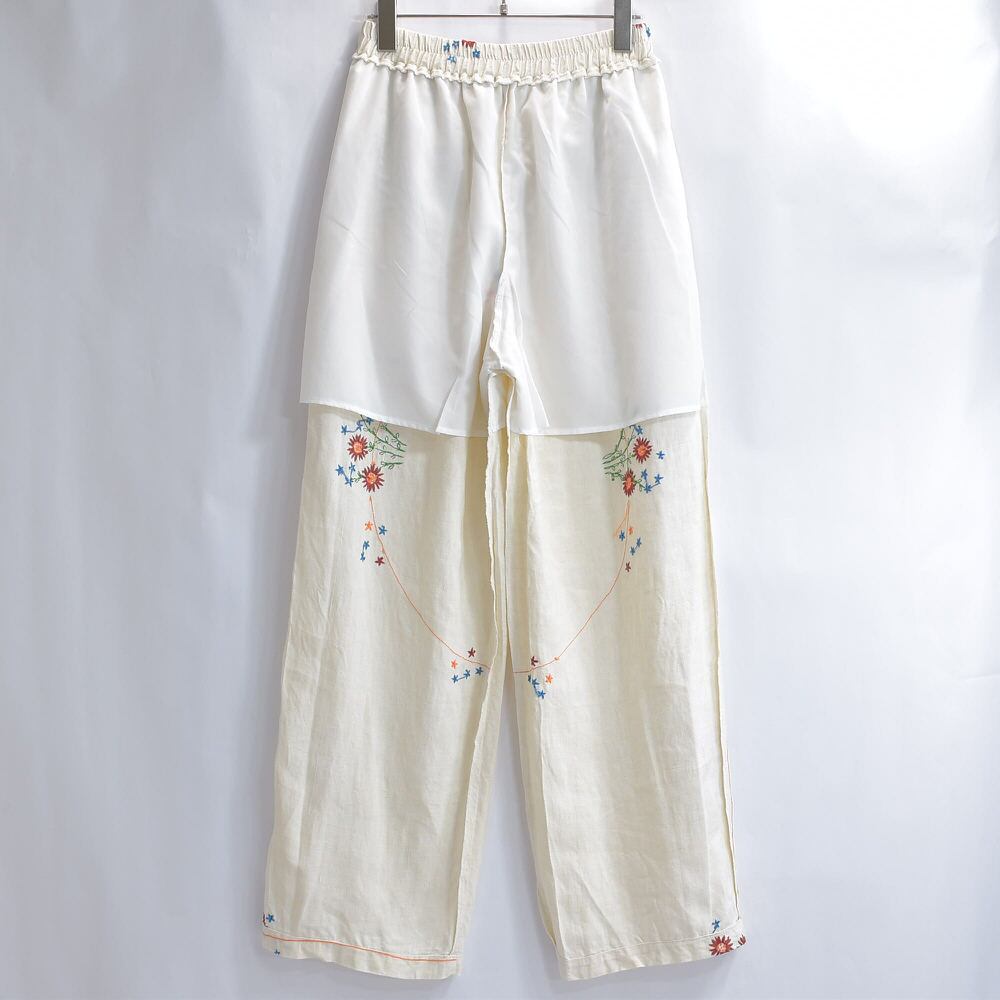 Remakeリメイク 再構築 パッチワーク&フラワー刺繍 デザイン ルーズシルエット コットン リネン イージーパンツ アイボリー 古着 裏地付き レディースW64〜92cm