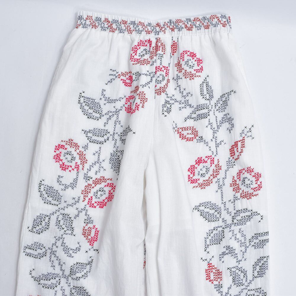 Remakeリメイク 再構築 パッチワーク&フラワー刺繍 デザイン ルーズシルエット コットン イージーパンツ エシカル ホワイト 古着 裏地付き レディースW64〜90cm