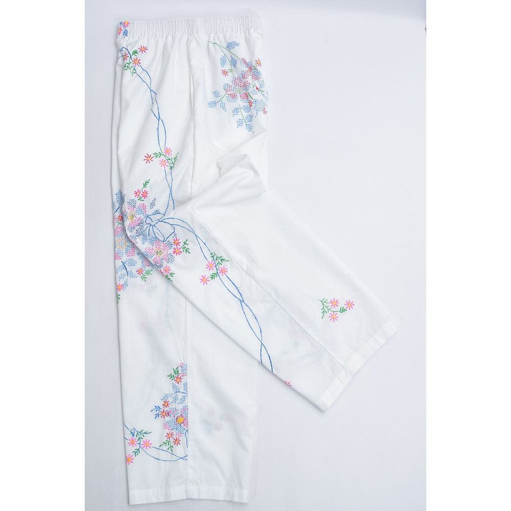 Remakeリメイク 再構築 パッチワーク&フラワー刺繍 デザイン ルーズシルエット コットン イージーパンツ ホワイト 古着 裏地付き レディースW64~90cm