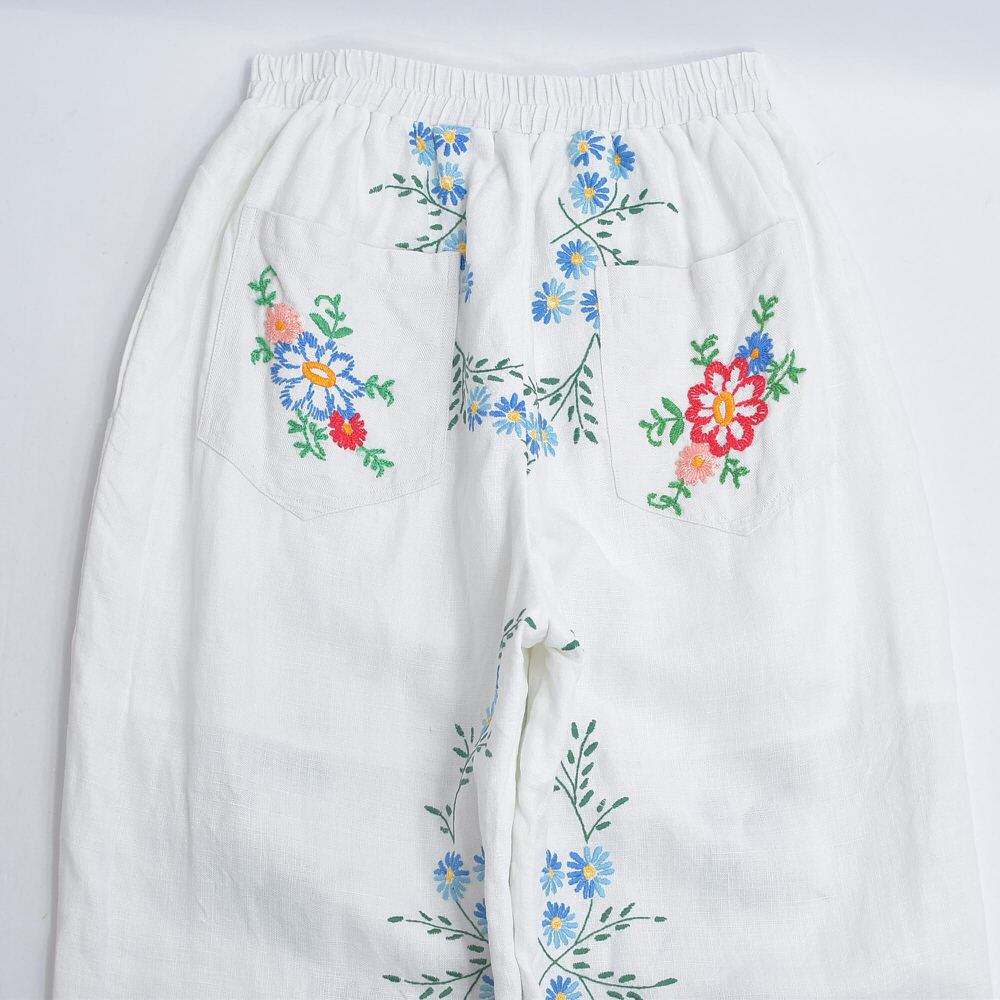 Remakeリメイク 再構築 パッチワーク&フラワー刺繍 デザイン ルーズシルエット コットン リネン イージーパンツ ホワイト 古着 裏地付き レディースW62〜90cm