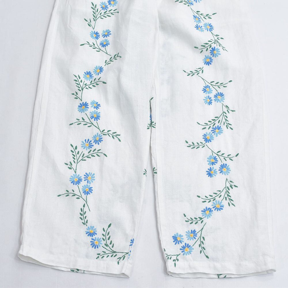 Remakeリメイク 再構築 パッチワーク&フラワー刺繍 デザイン ルーズシルエット コットン リネン イージーパンツ ホワイト 古着 裏地付き レディースW62~90cm