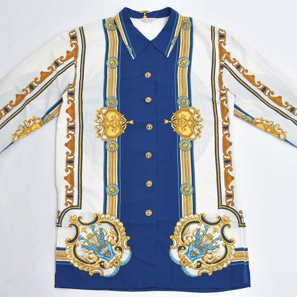 80~90s FELICE ラグジュアリーパターン スカーフ柄 総柄 ポリエステル オープンカラーシャツ 長袖 ヴィンテージ アイボリー ネイビー アンティーク調 ビンテージ 古着 レディース XL~相当