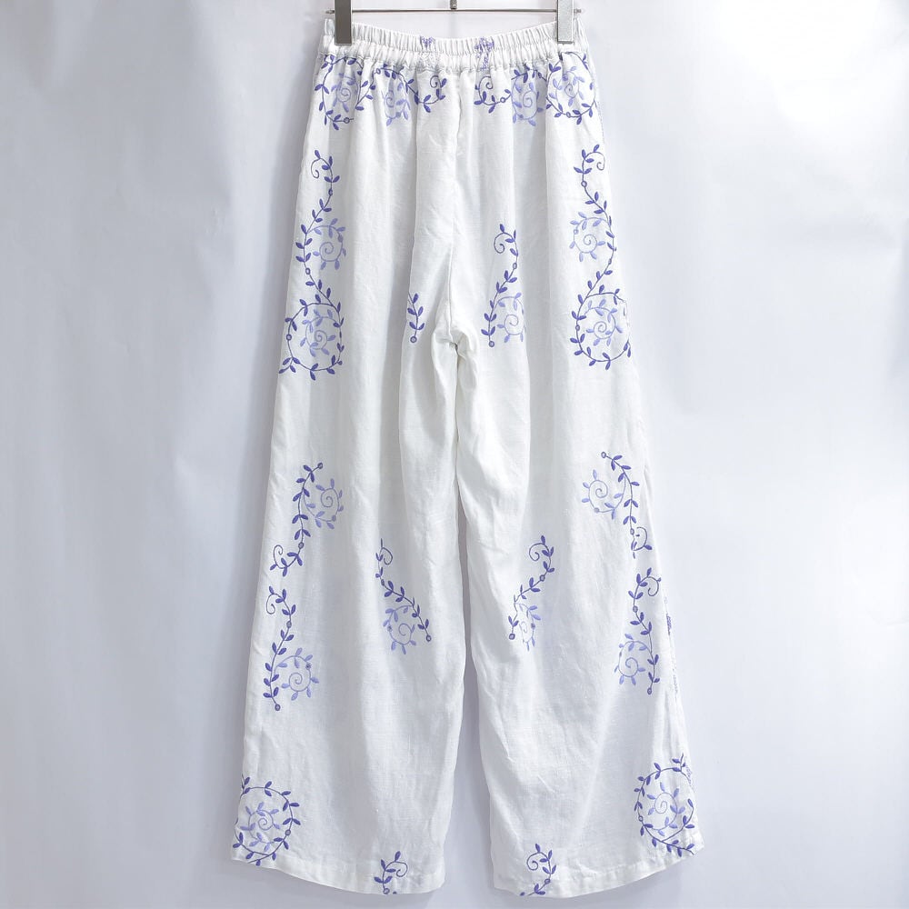 Remakeリメイク 再構築 パッチワーク&フラワー刺繍 デザイン ルーズシルエット コットン イージーパンツ ホワイト 古着 裏地付き レディースW62〜92cm