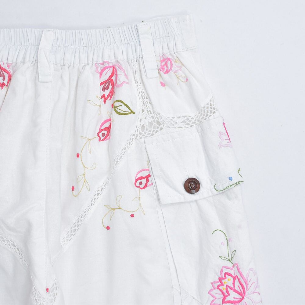 可愛らしいお花やハシゴレースが描かれた刺繍生地をボトムスに再構築したリメイクパンツ