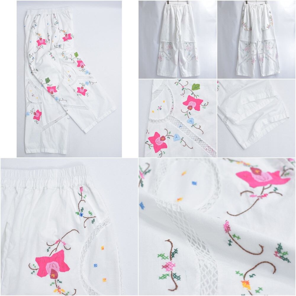 Remakeリメイク 再構築 パッチワーク&フラワー刺繍 デザイン ルーズシルエット コットン ワイドイージーパンツ ホワイト 古着 裏地付き レディースW70~102cm