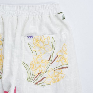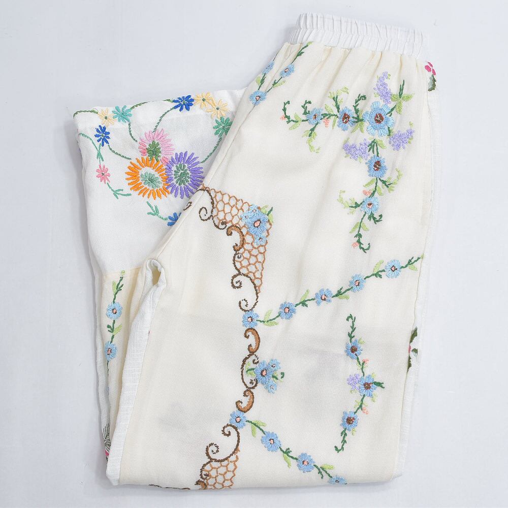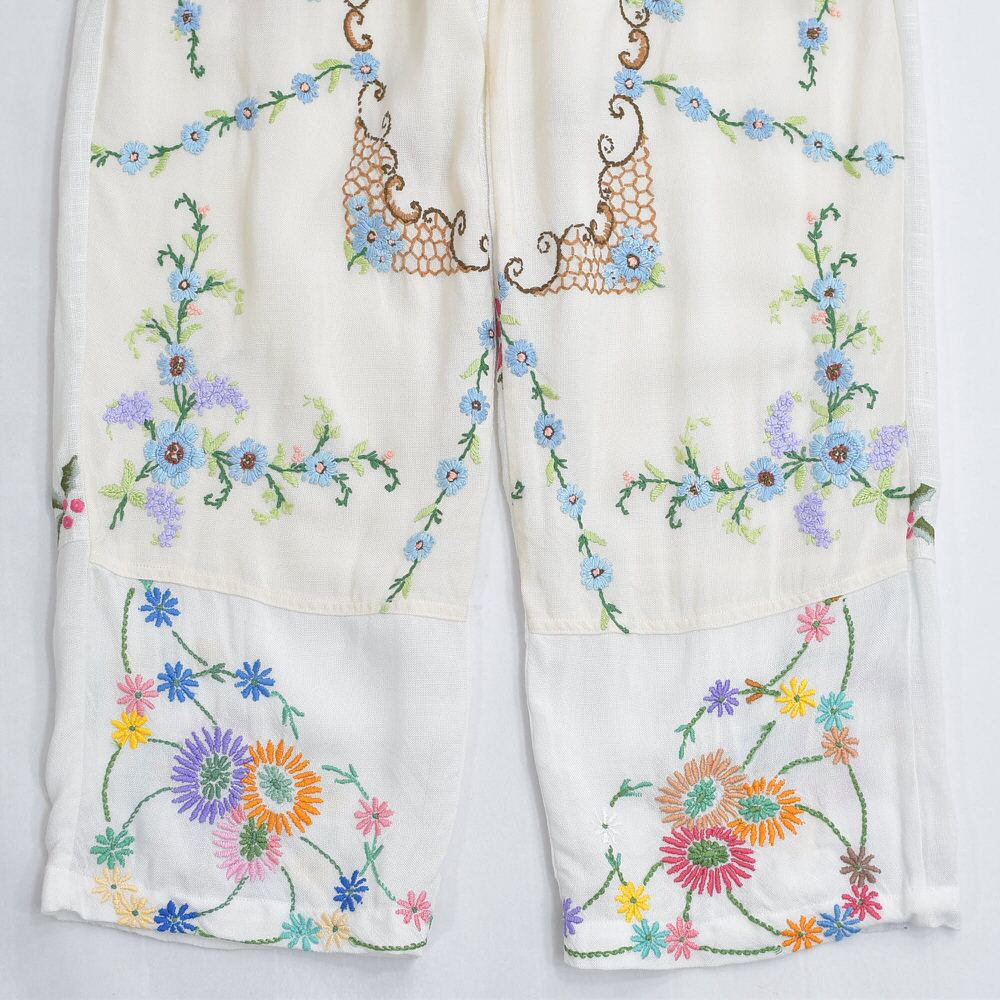 ノスタルジックな趣を感じる可憐なお花が描かれた刺繍クロスの生地をボトムスに再構築したパッチワークのリメイクパンツ