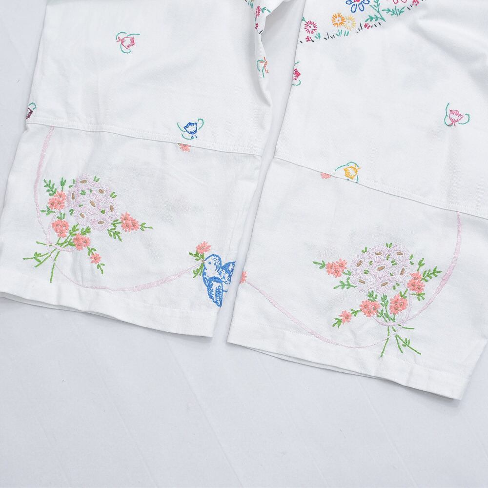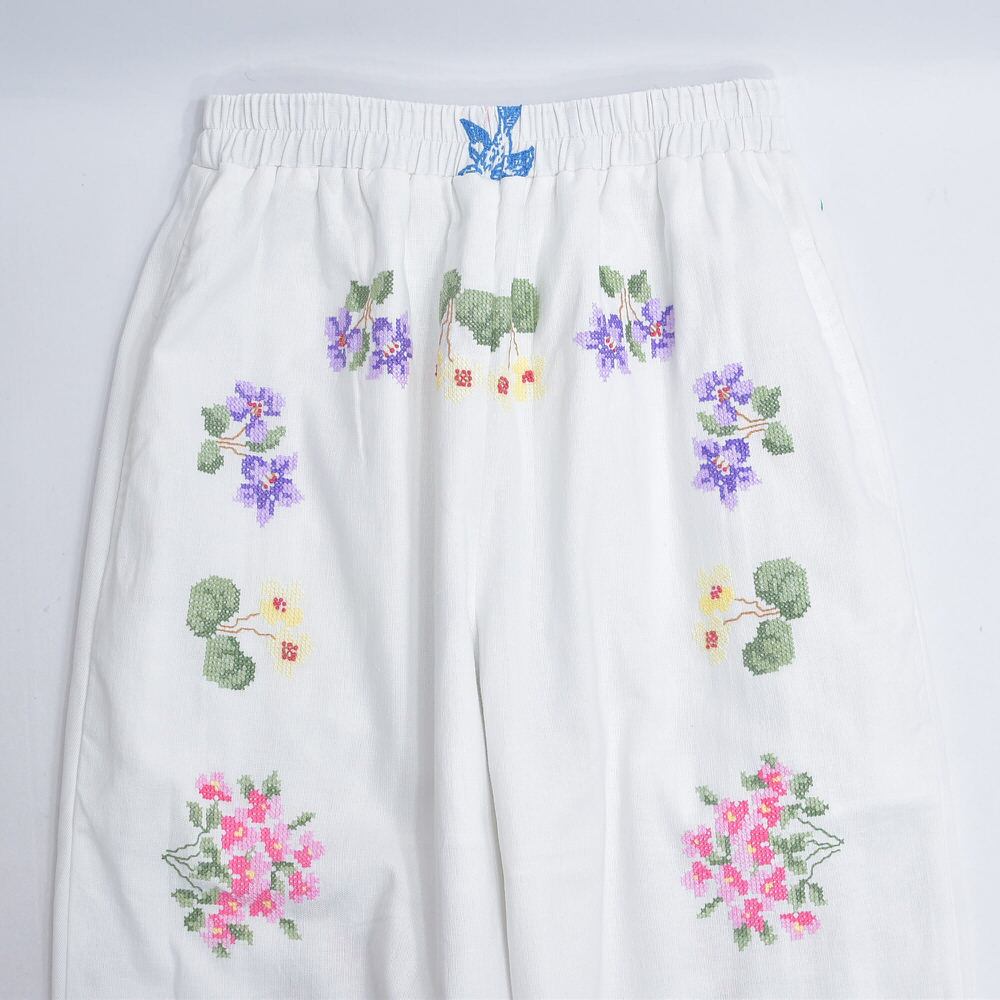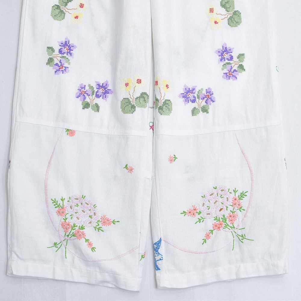 可愛らしいお花が描かれた刺繍クロスの生地をボトムスに再構築したパッチワークのリメイクパンツ