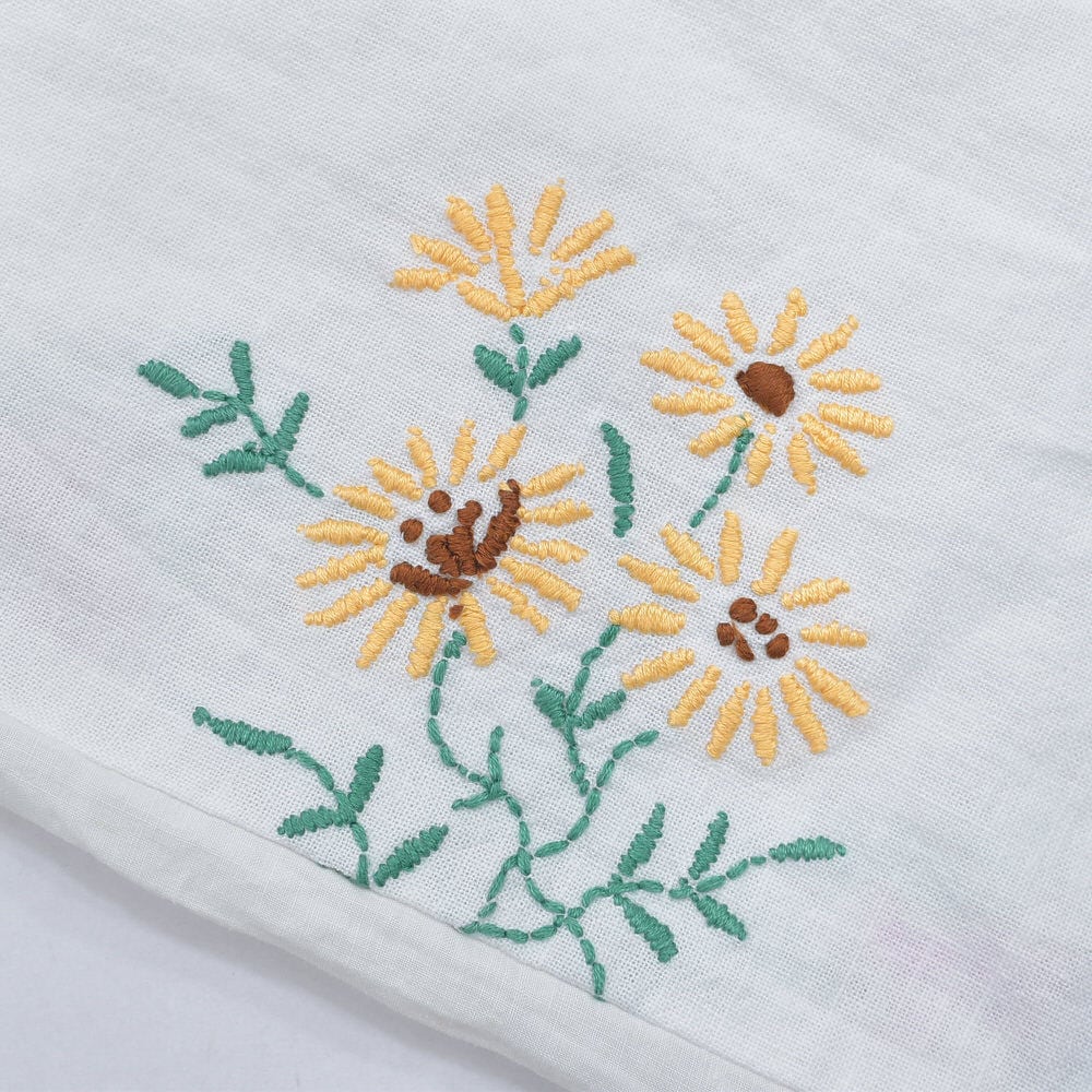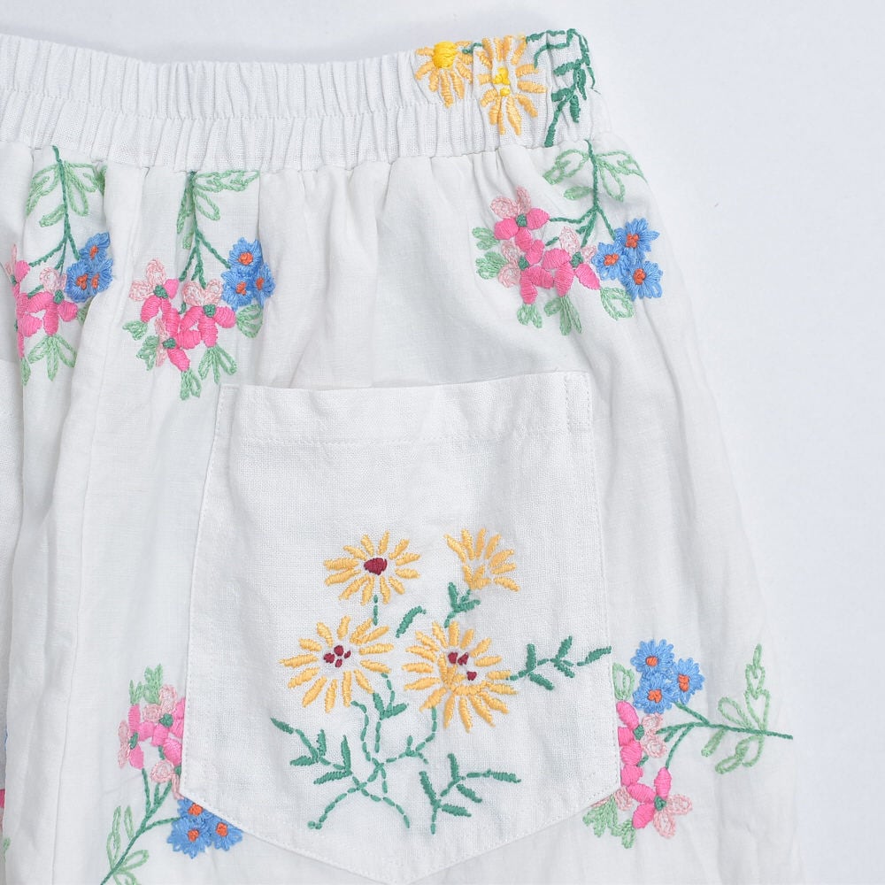 可愛らしいお花が描かれた刺繍クロスの生地をボトムスに再構築したパッチワークのリメイクパンツ