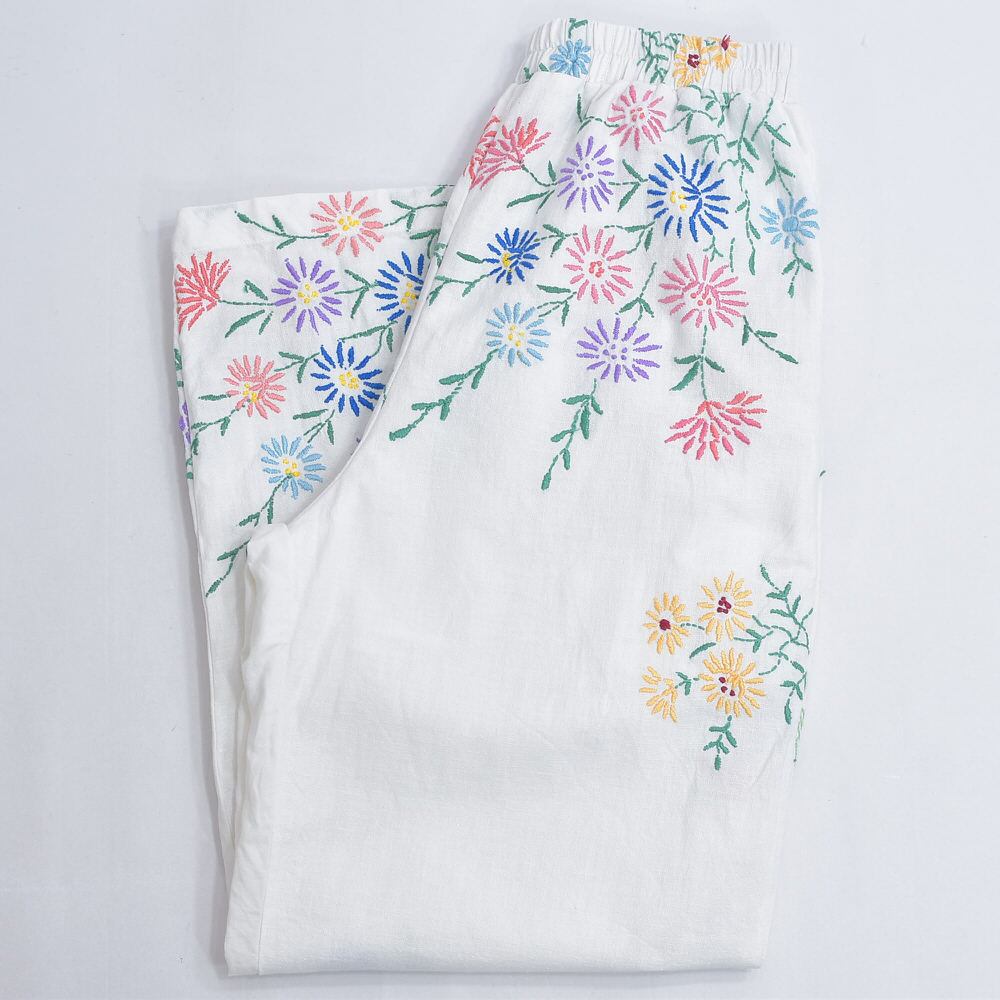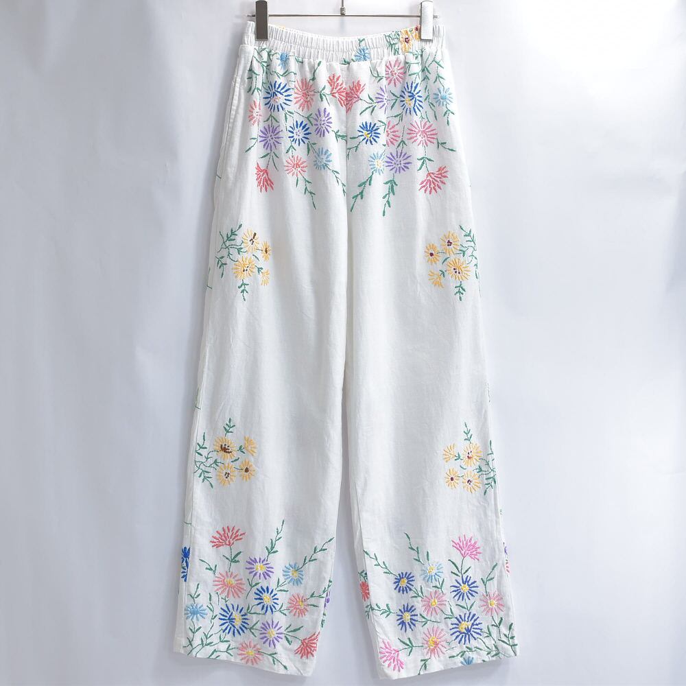 Remakeリメイク 再構築 パッチワーク&フラワー デザイン ルーズシルエット コットン リネン イージーパンツ ホワイト 古着 裏地付き レディースW64~96cm