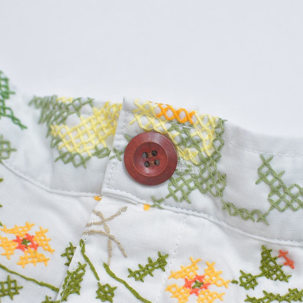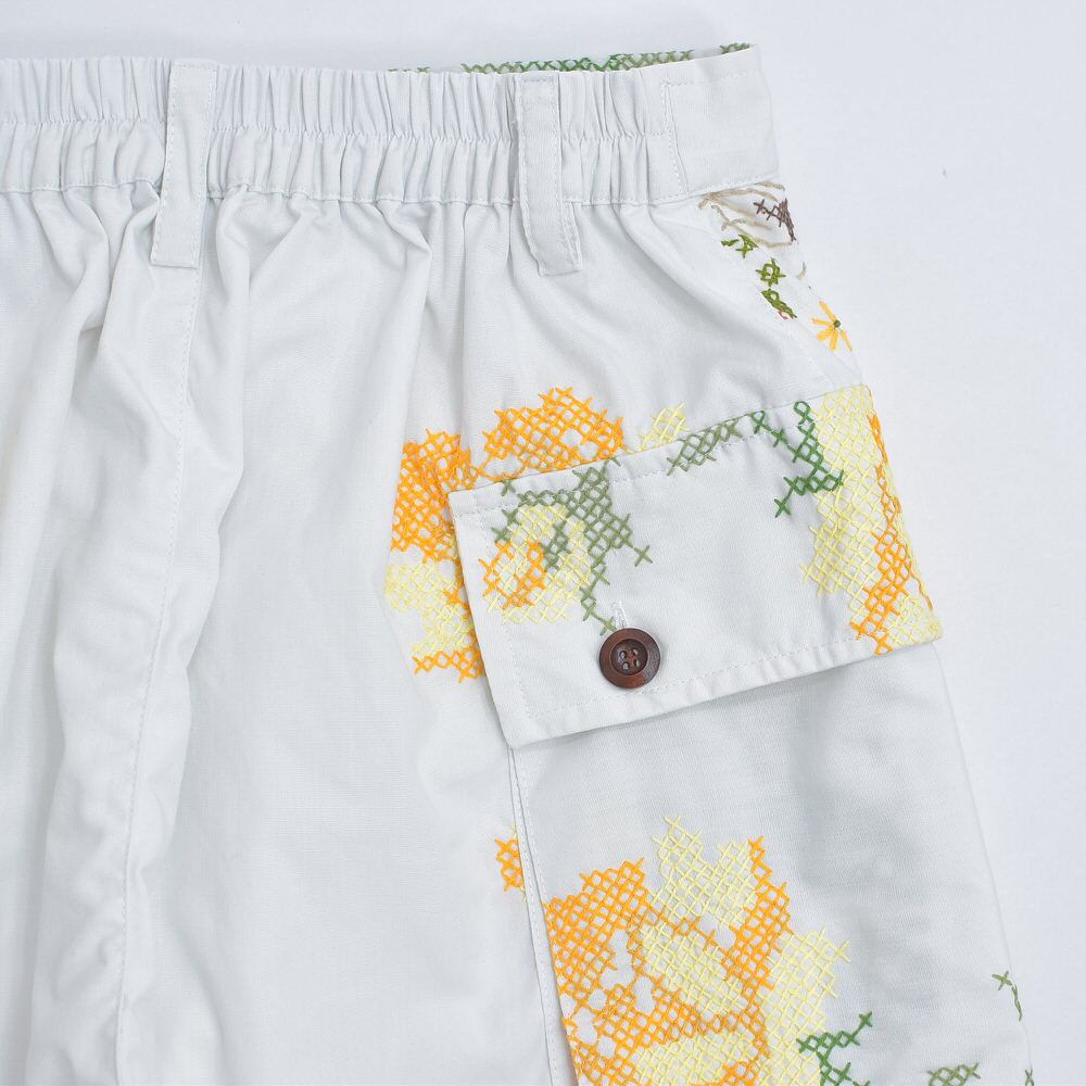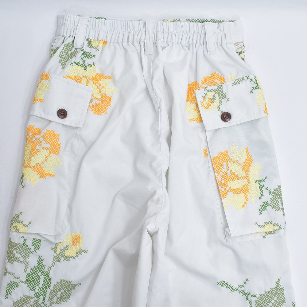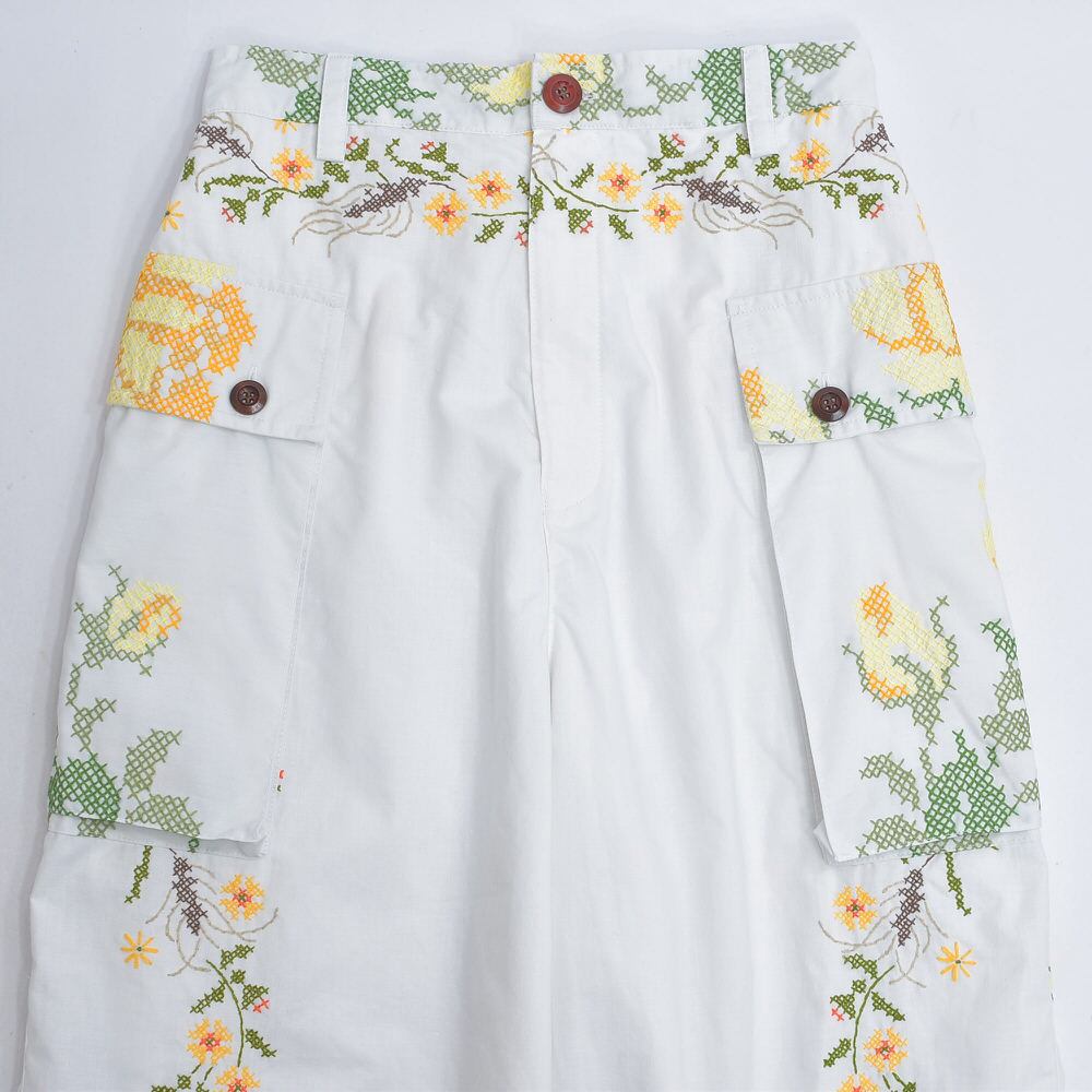 可愛らしいお花の刺繍が描かれたクロス生地をボトムスに再構築したリメイクパンツ