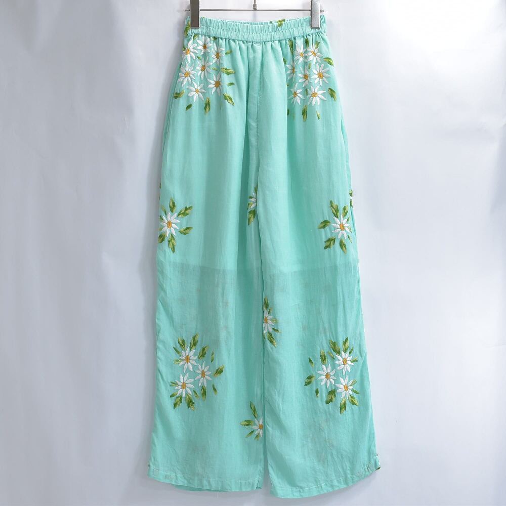 Remakeリメイク 再構築 パッチワーク&フラワー デザイン ルーズシルエット リネン イージーパンツ ミントグリーン 古着 裏地付き レディースW58~98cm