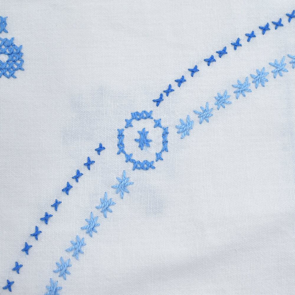 上品な趣を感じる、幾何学的な模様が描かれたクロスステッチ刺繍の生地をボトムスに再構築したリメイクパンツ