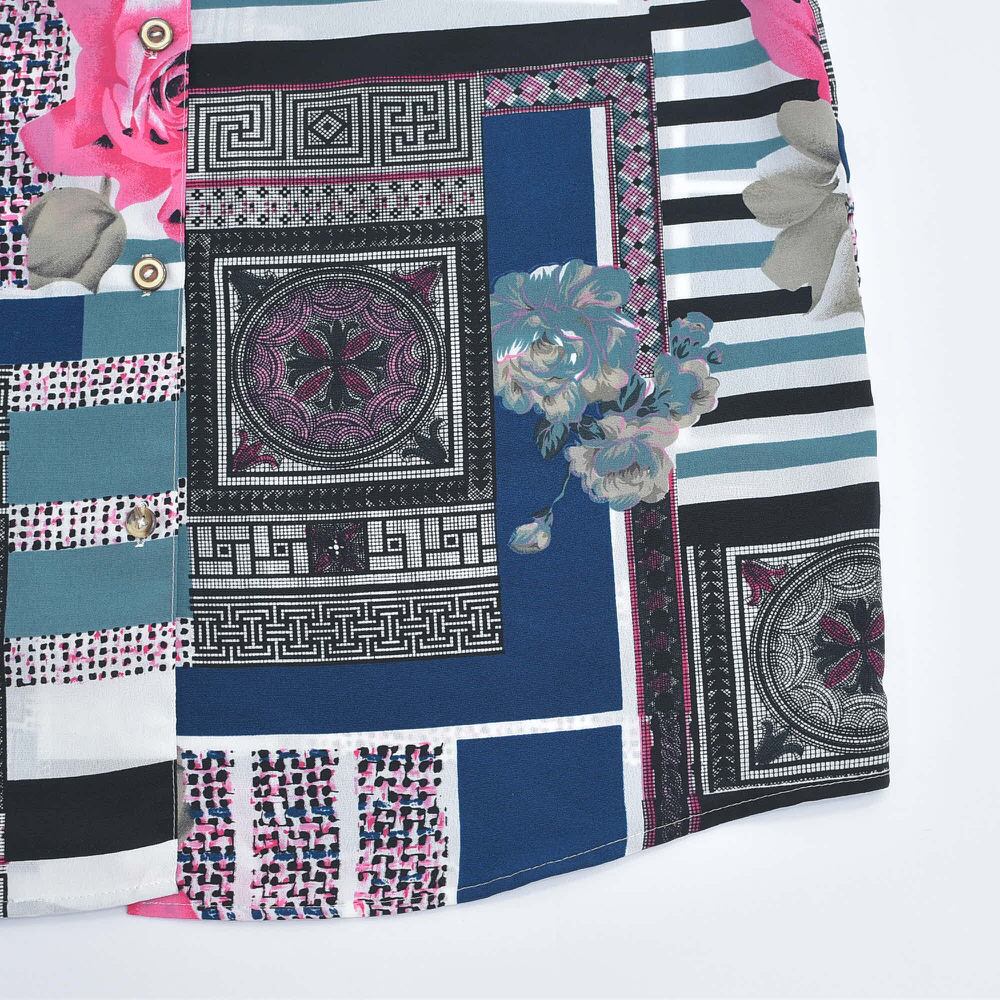 80~90s Mon enfant モンアンファン スカーフ柄 幾何学模様 ローズ アート 総柄 半袖 シャツ ブラウス 昭和レトロ 古着 ヴィンテージ ブルー ビンテージ レディースL相当