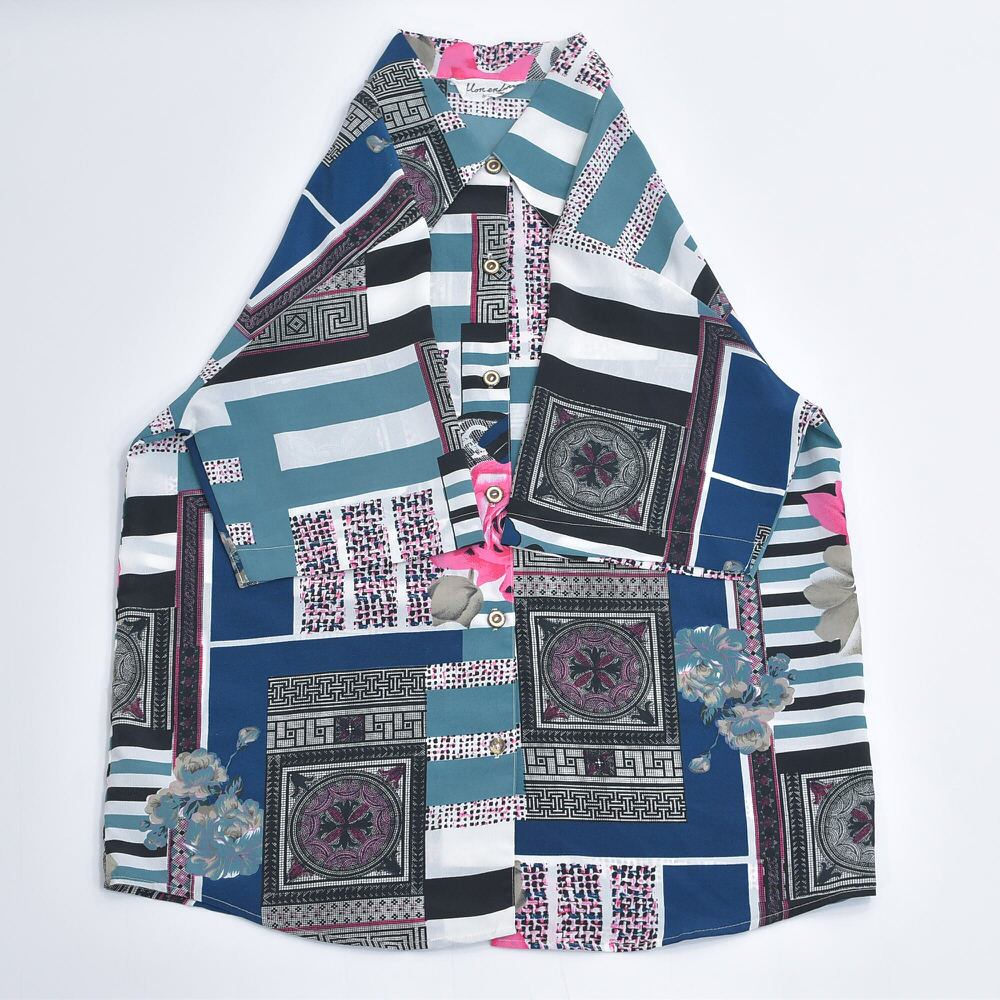 80〜90s Mon enfant モンアンファン スカーフ柄 幾何学模様 ローズ アート 総柄 半袖 シャツ ブラウス 昭和レトロ 古着 ヴィンテージ ブルー ビンテージ レディースL相当