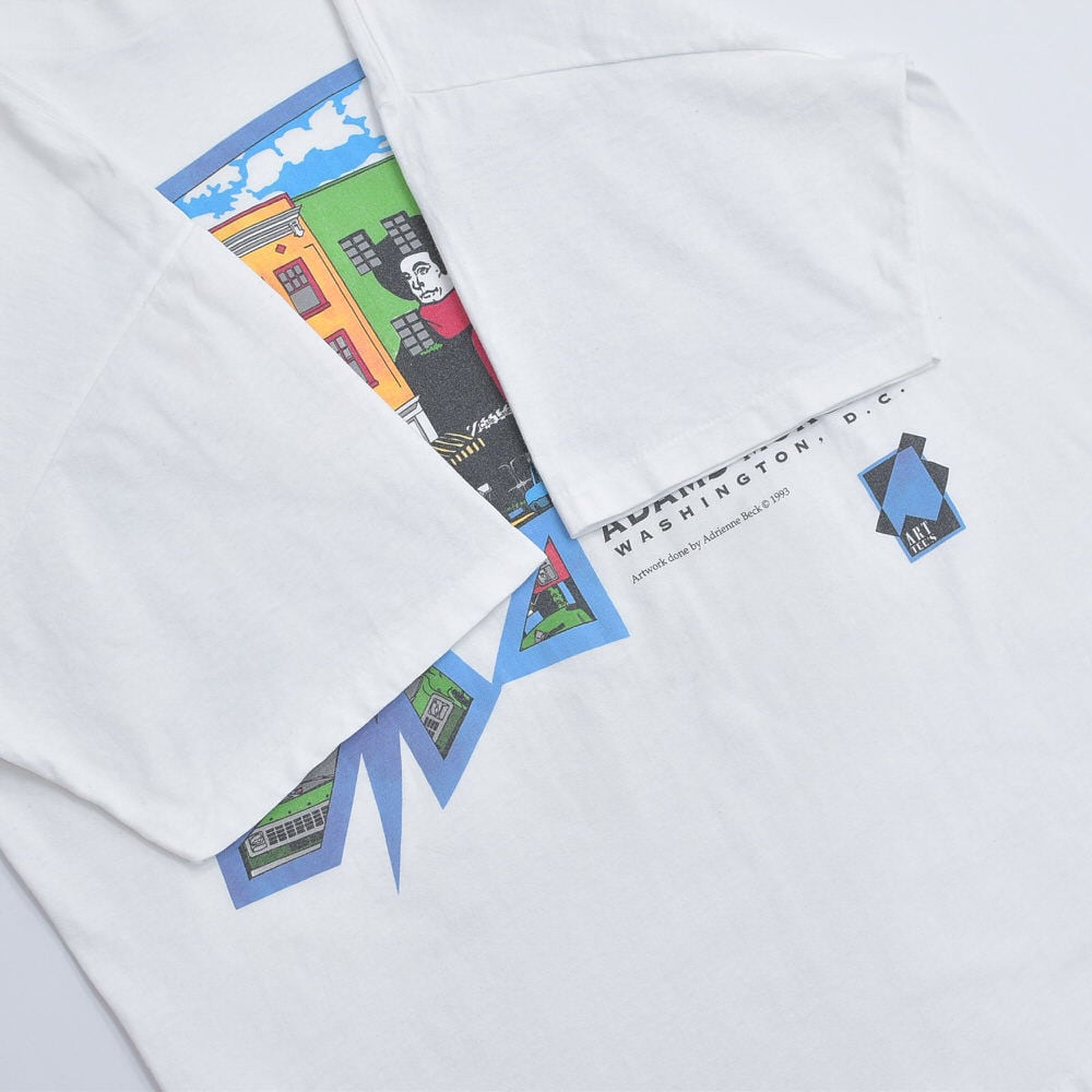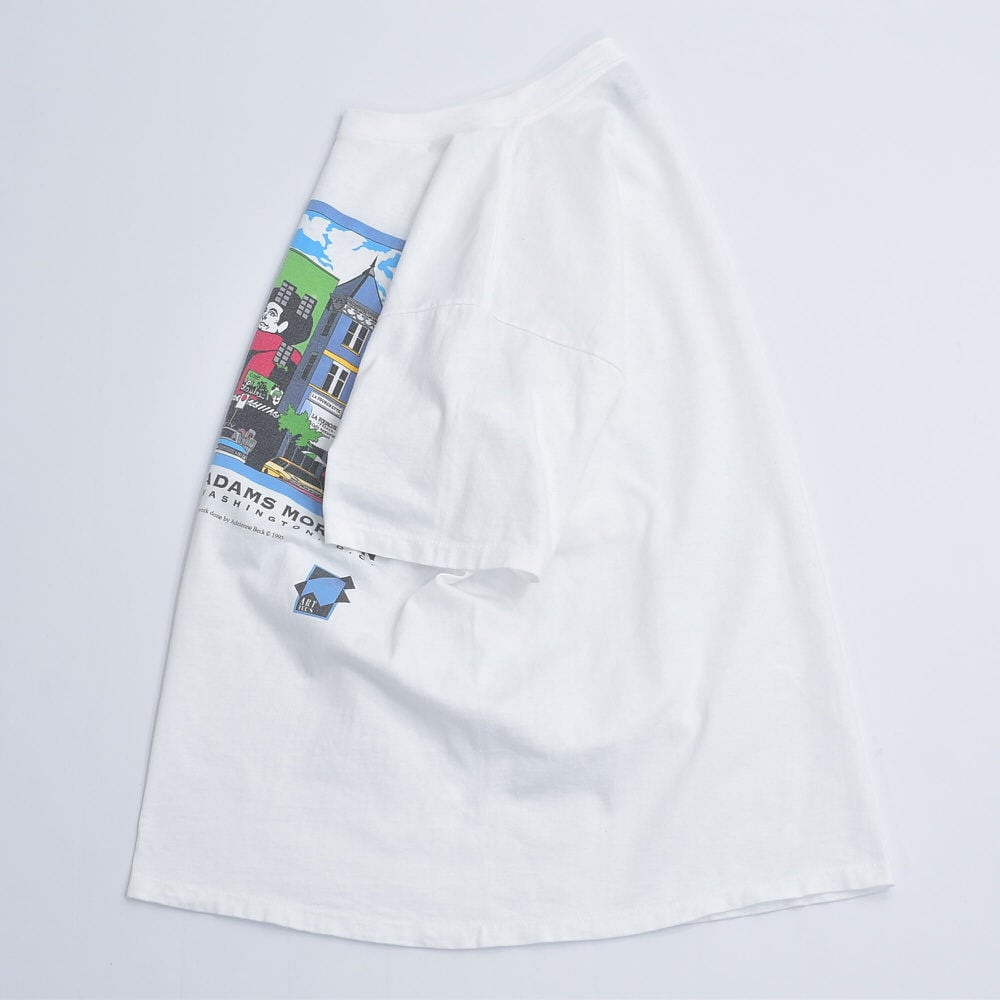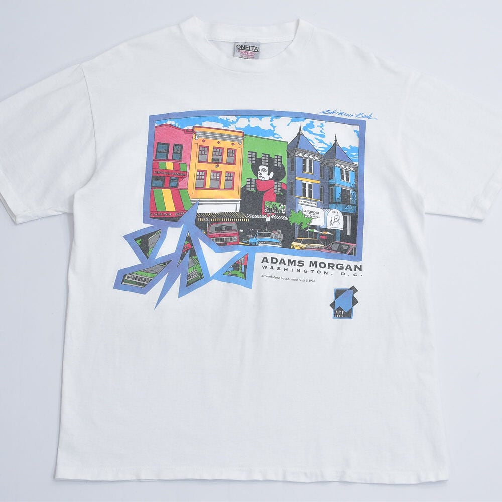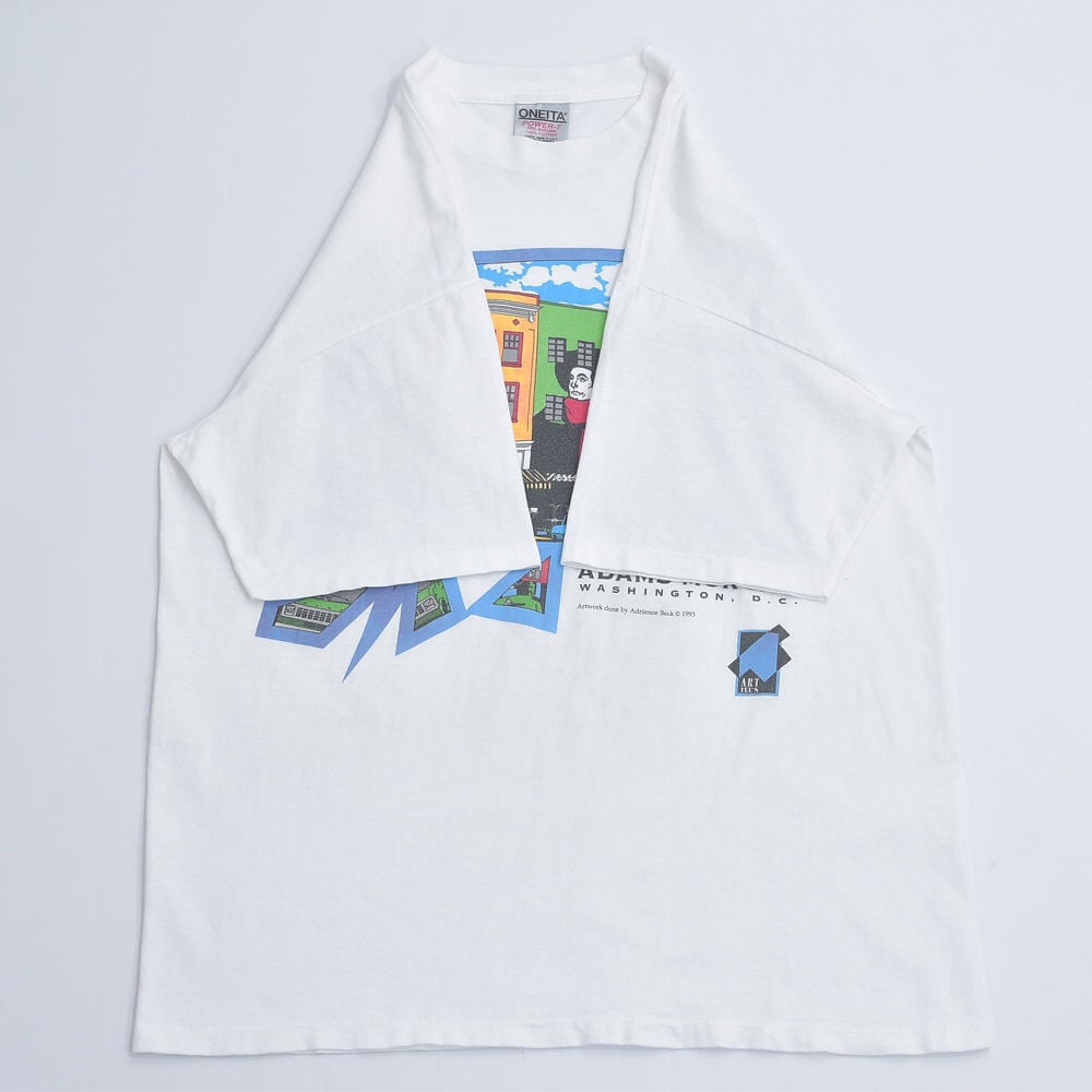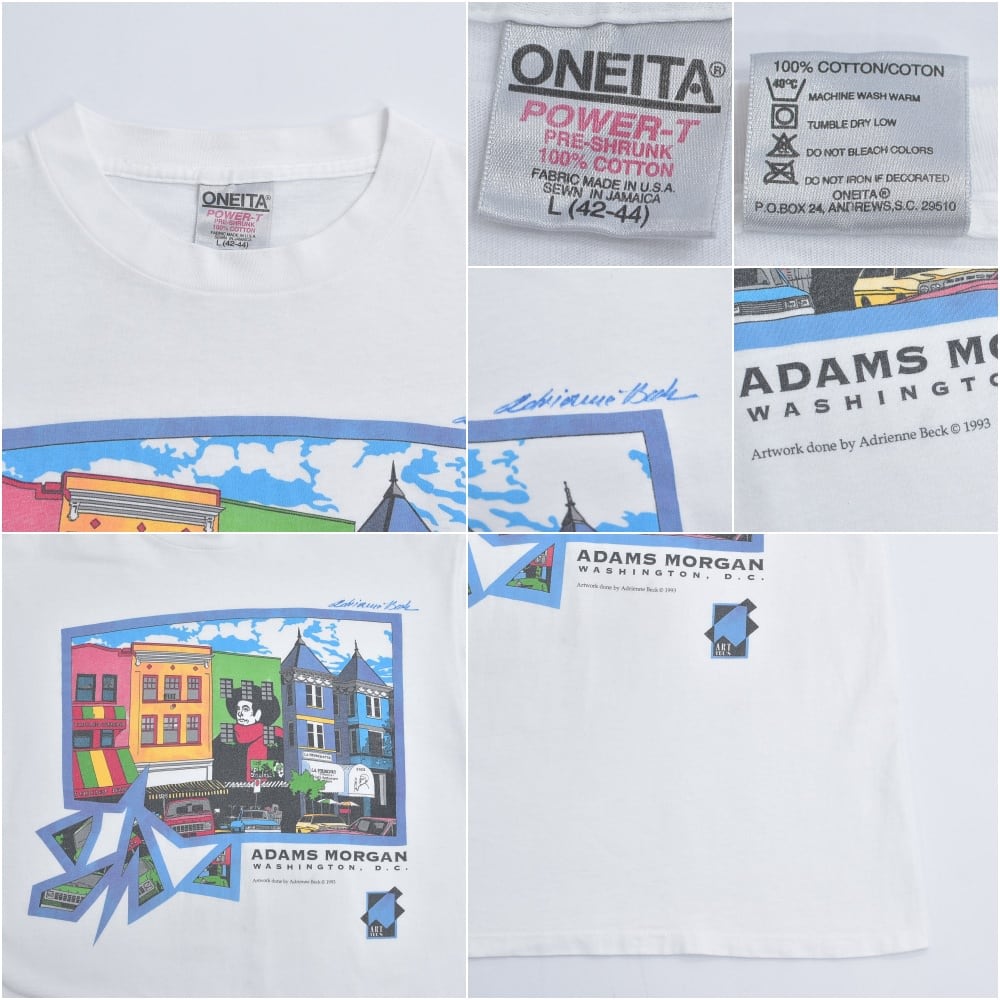 90s USA製生地 ONEITA オニータ Adrienne Beck アート Tシャツ ワシントンDC シングルステッチ POWER-T アダムスモーガン 白 ヴィンテージ ホワイトビンテージ USA アメリカ古着 メンズLサイズ