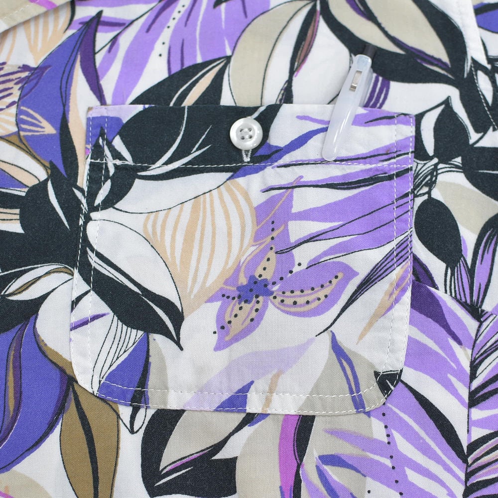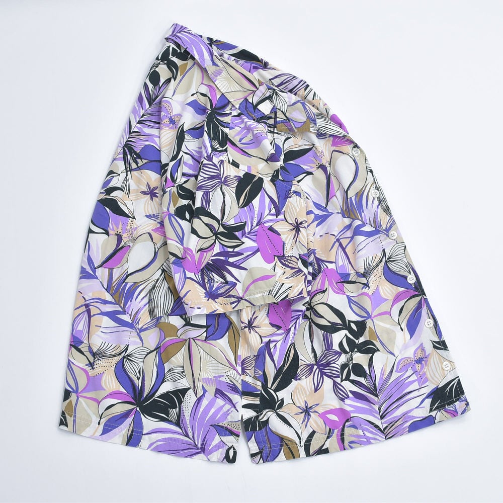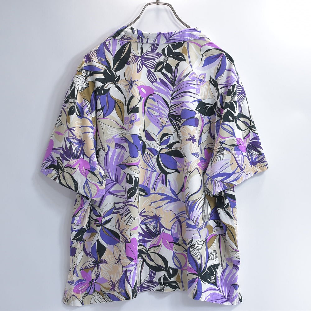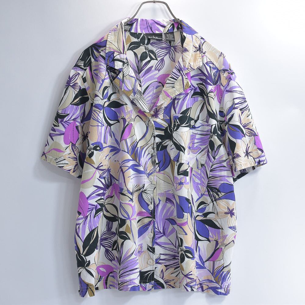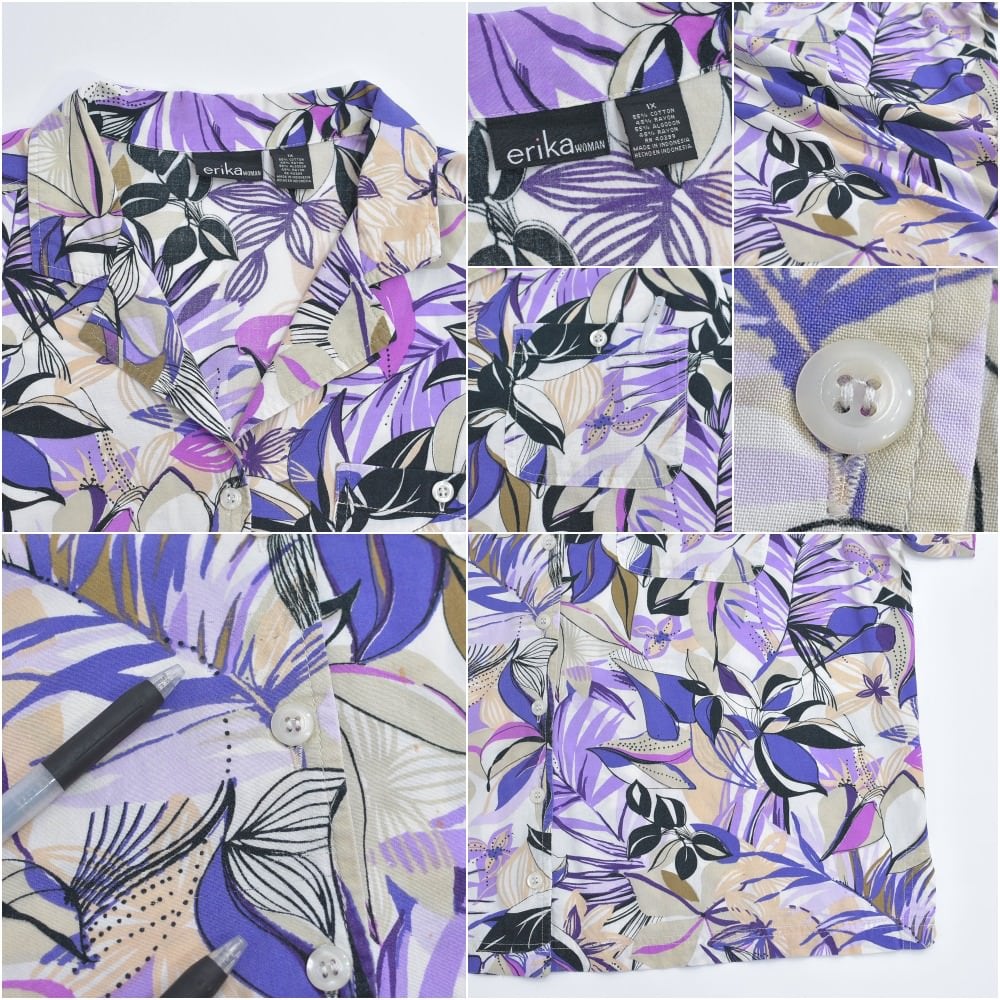 90~00s erika WOMAN エリカウーマン 花柄 ボタニカル柄 開襟 オープンカラー 半袖シャツ フローラル リゾート パープル ヴィンテージ ブラウス ビンテージ USA アメリカ古着 レディースXL相当