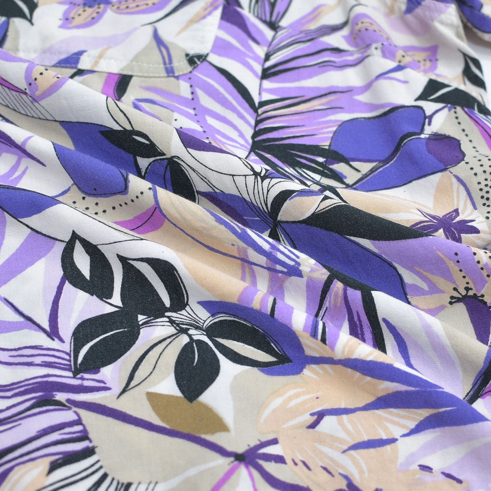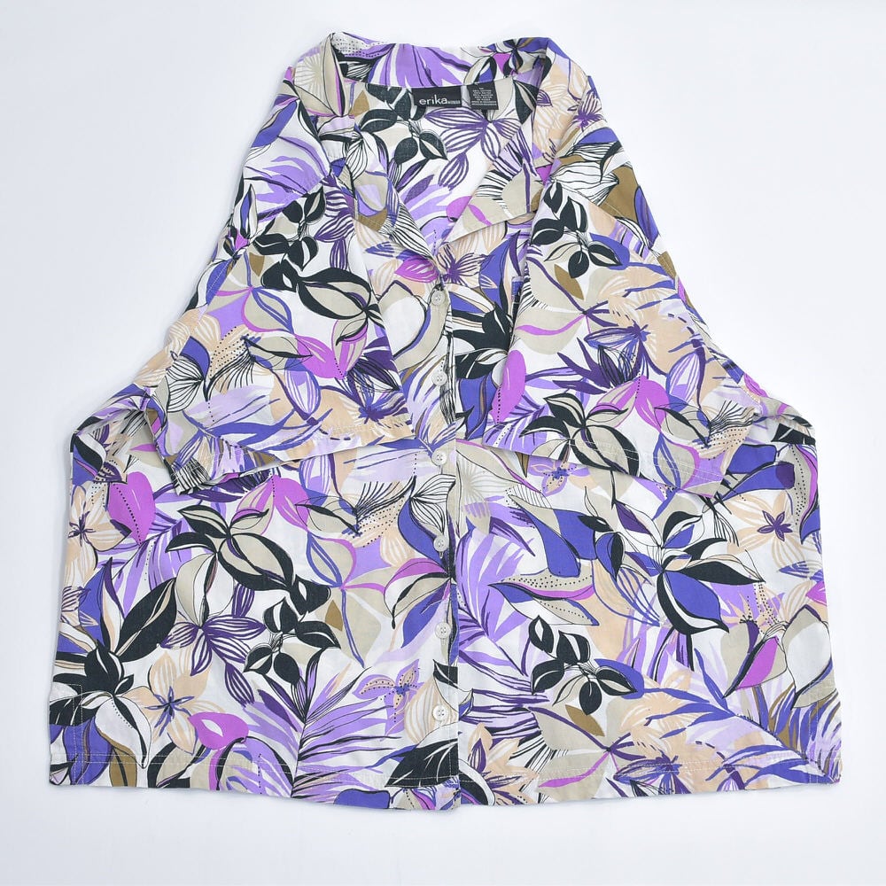 90〜00s erika WOMAN エリカウーマン 花柄 ボタニカル柄 開襟 オープンカラー 半袖シャツ フローラル リゾート パープル ヴィンテージ ブラウス ビンテージ USA アメリカ古着 レディースXL相当