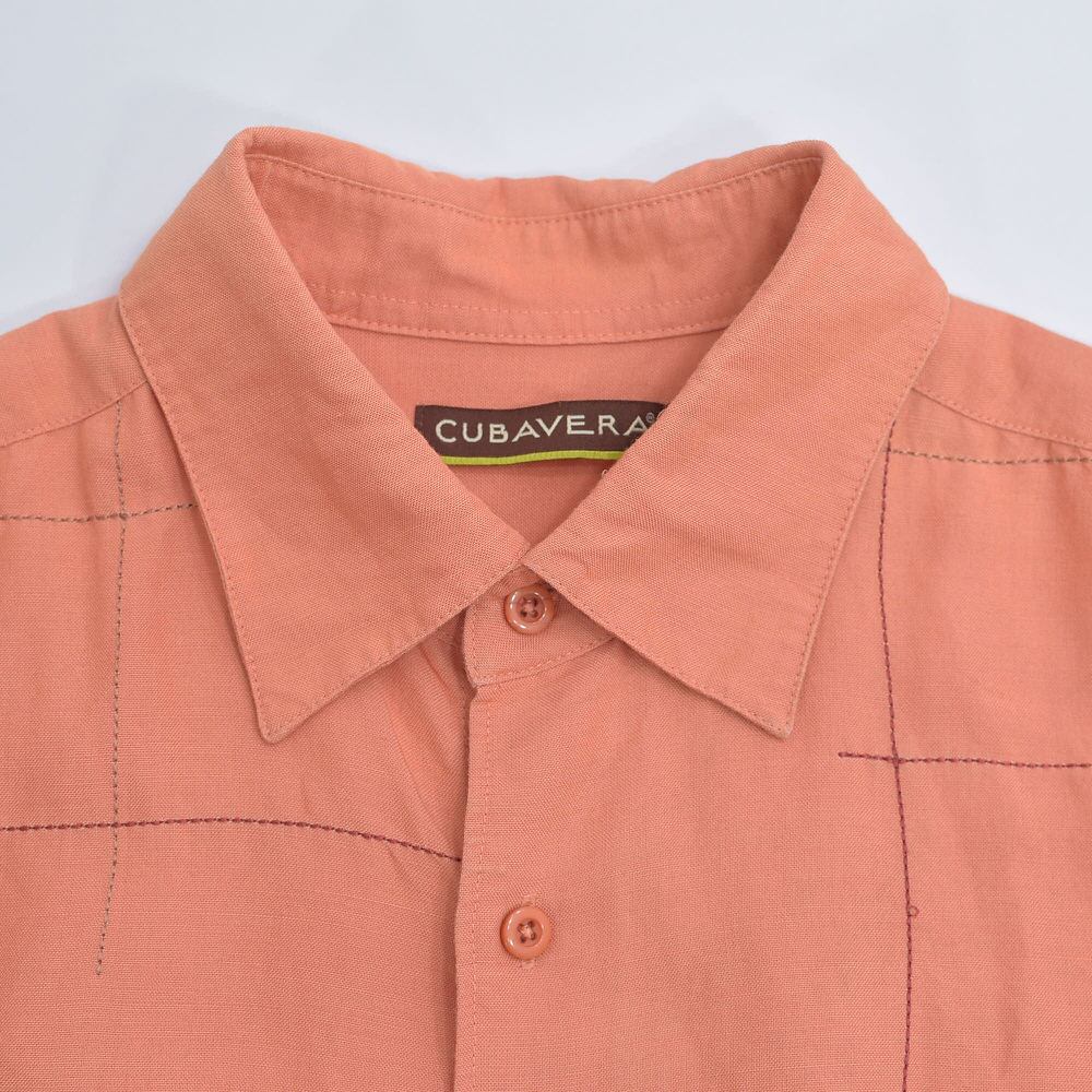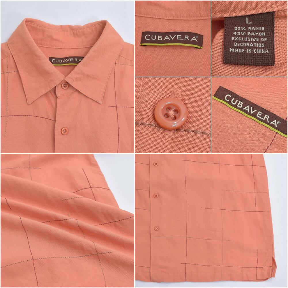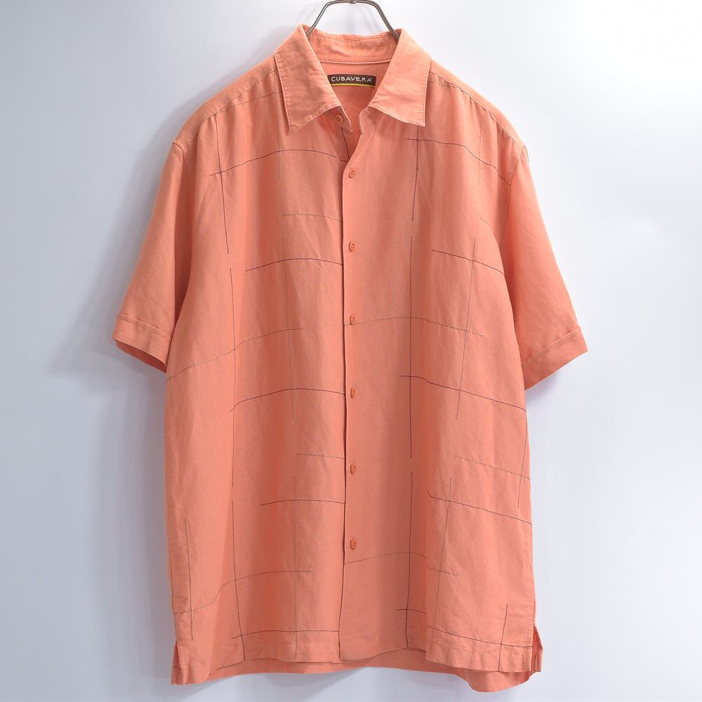 00s CUBAVERA キューバベラ グリッドステッチ デザイン ラミー レーヨン 半袖シャツ Y2K サーモンピンク ヴィンテージ 麻 ビンテージ USA アメリカ古着 メンズLサイズ