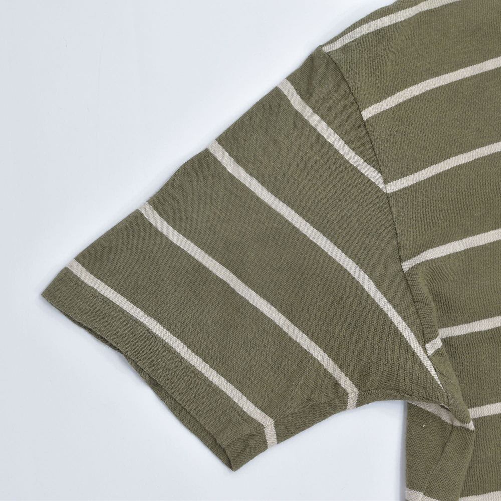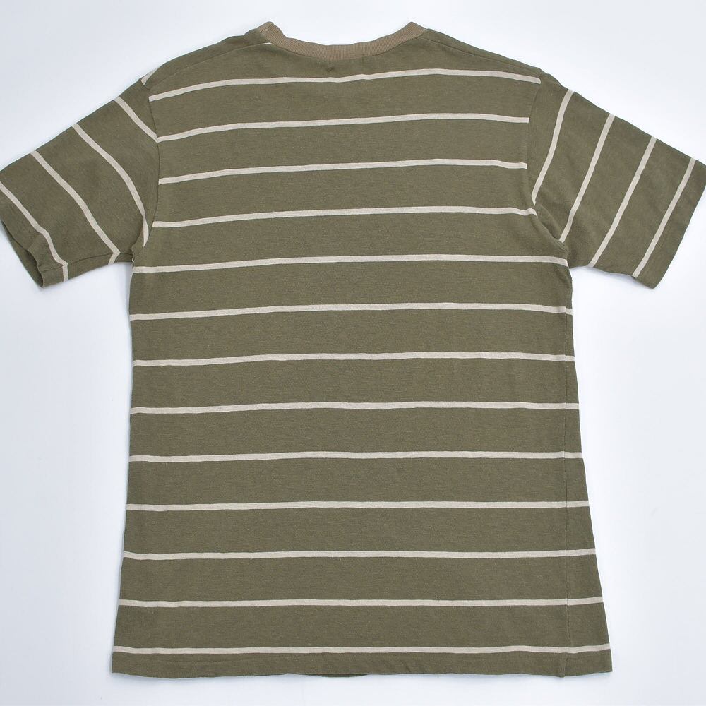 90〜00s Used クルーネック ボーダーデザイン Tシャツ カットソー アースカラー オリーブ カーキ ヴィンテージ シングルステッチ ビンテージ 古着 メンズS相当