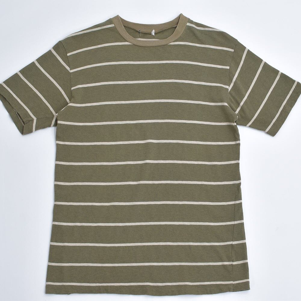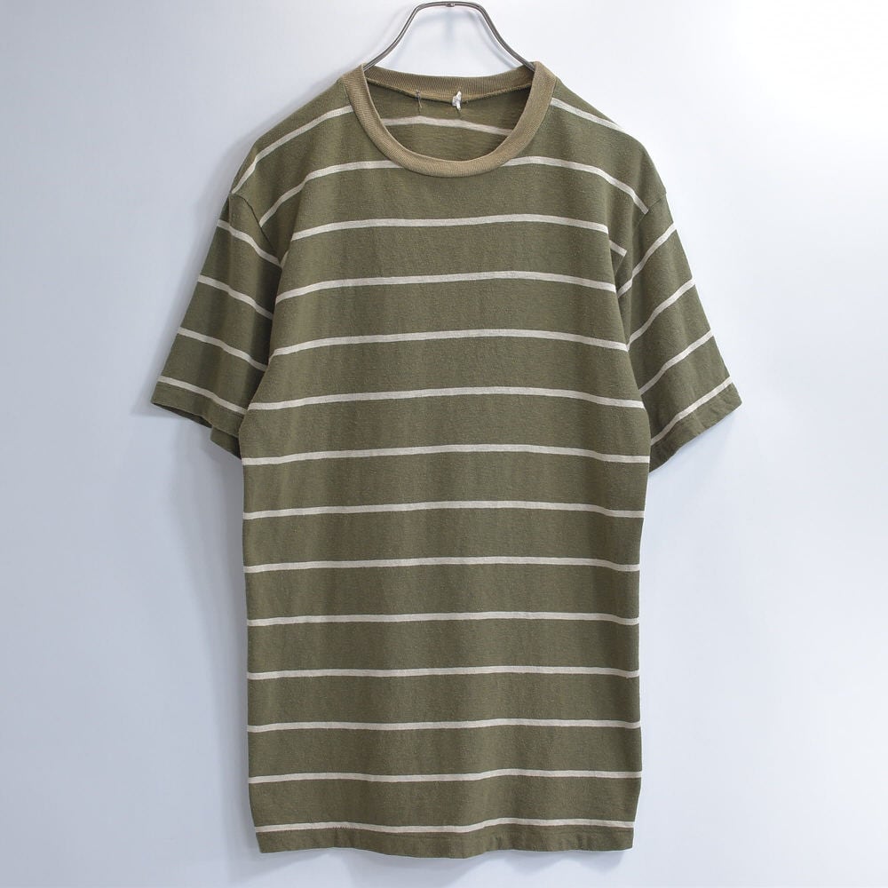 90~00s Used クルーネック ボーダーデザイン Tシャツ カットソー アースカラー オリーブ カーキ ヴィンテージ シングルステッチ ビンテージ 古着 メンズS相当