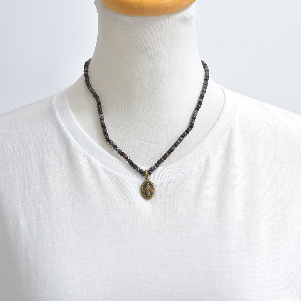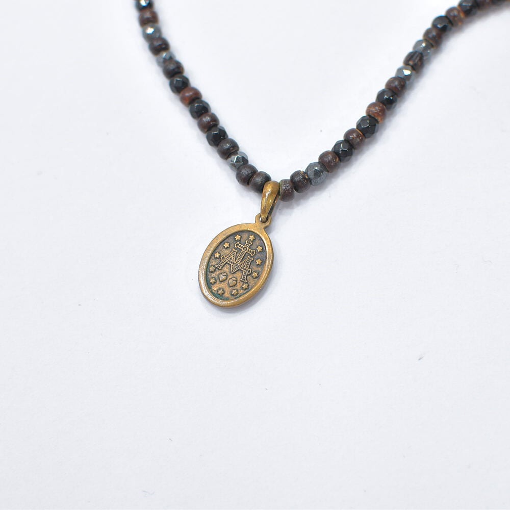 Used 不思議のメダイモチーフ ミックスビーズ ネックレス ブラスチャーム 聖母マリア アクセサリー ヴィンテージ ビンテージ 古着 ブラウン ブラック ユニセックスデザイン