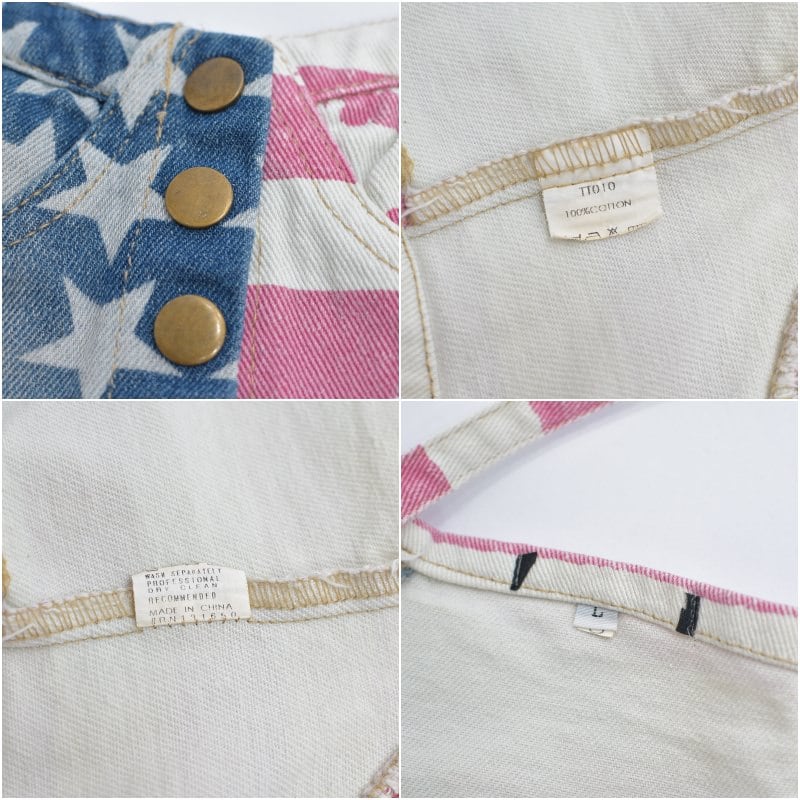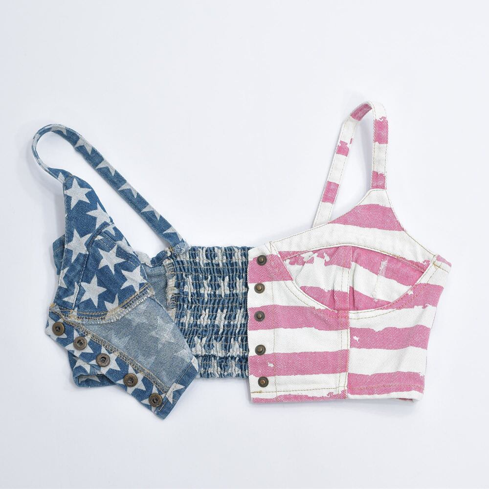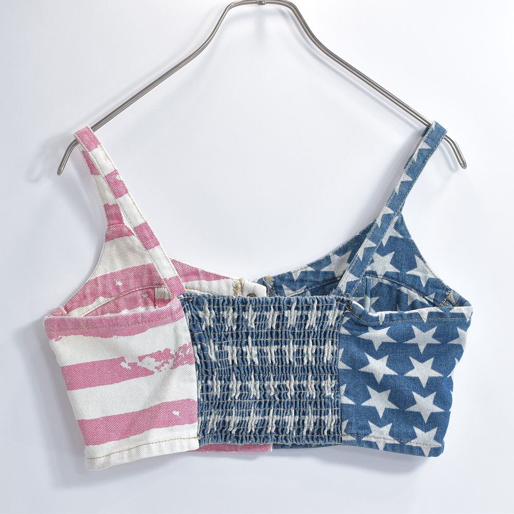 00s Used Y2K 星条旗モチーフ デザイン デニムビスチェ クロップド丈 トップス アシンメトリーデザイン ヴィンテージ 国旗柄 ビンテージ USA アメリカ古着 レディースLサイズ