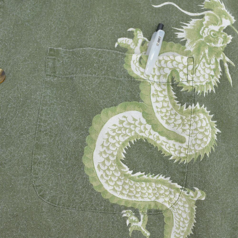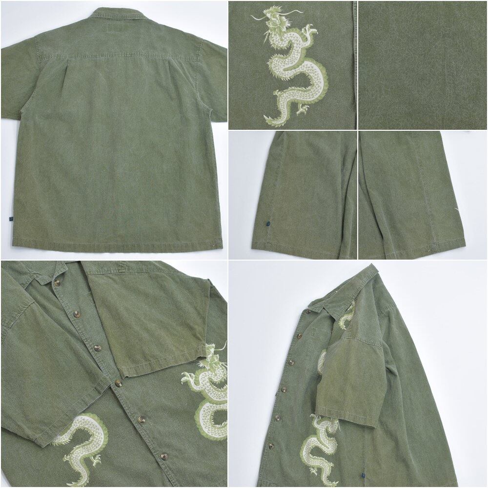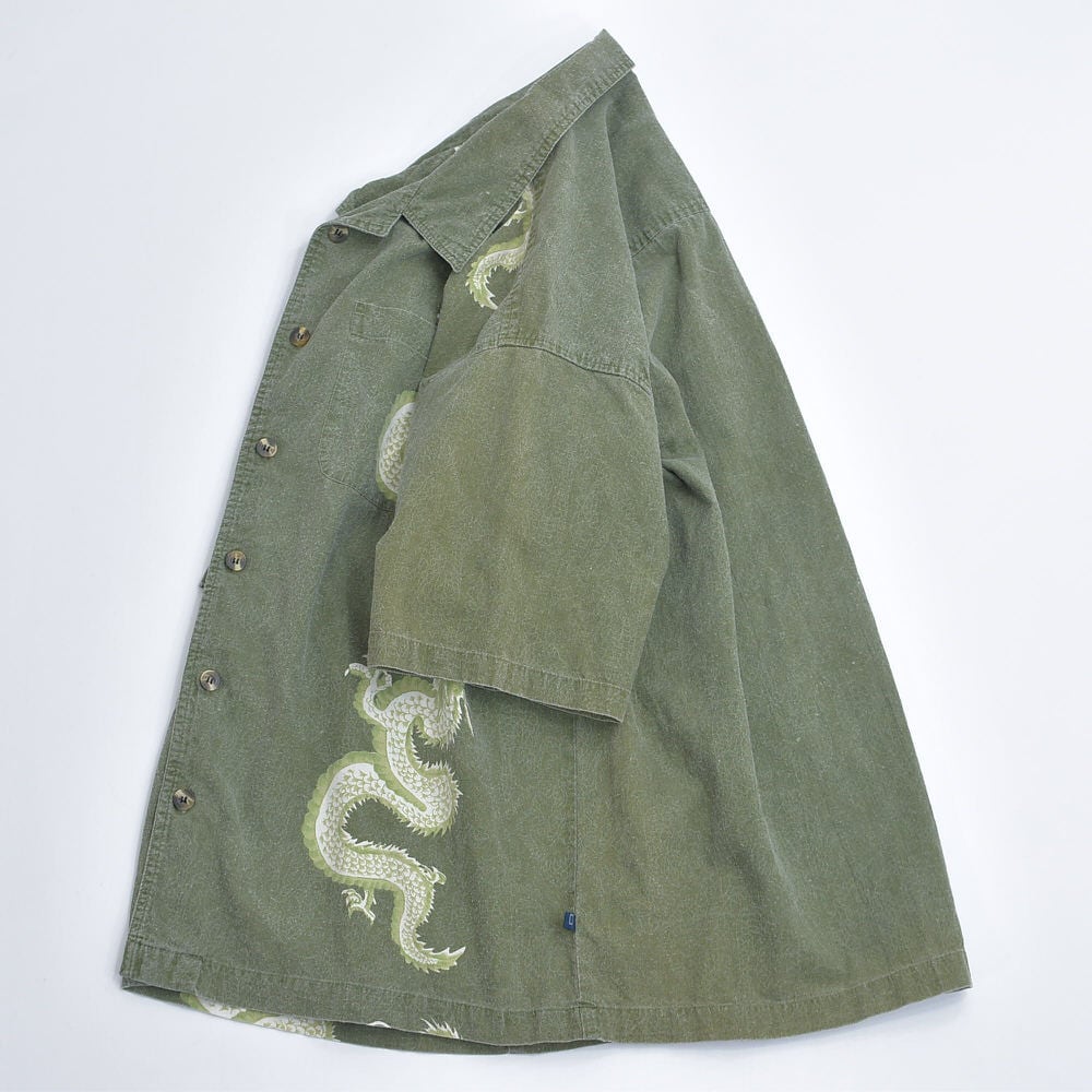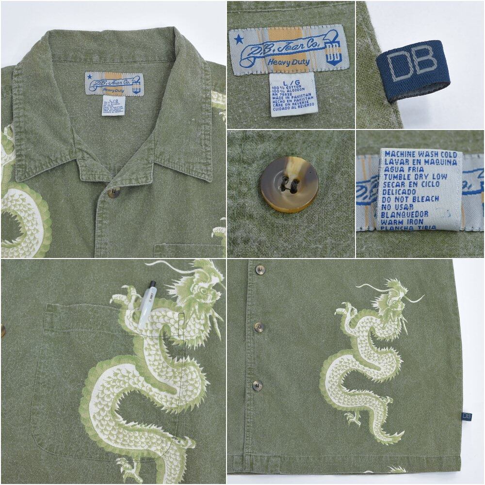 90s D.B. Jean Co. ディービージーンカンパニー ドラゴン 総柄 オープンカラー 半袖 コットン シャツ 龍 開襟シャツ ヴィンテージ カーキ ビンテージ アメリカ古着 メンズ XXL相当