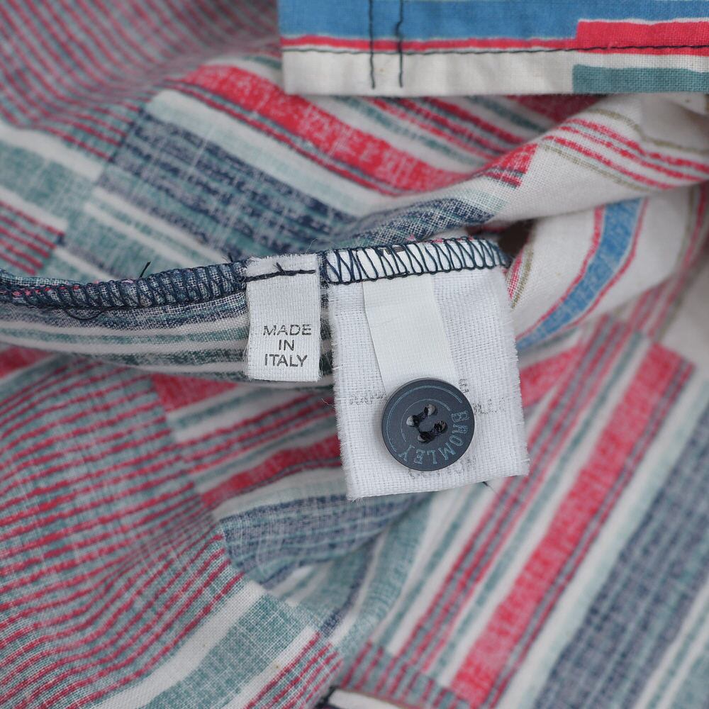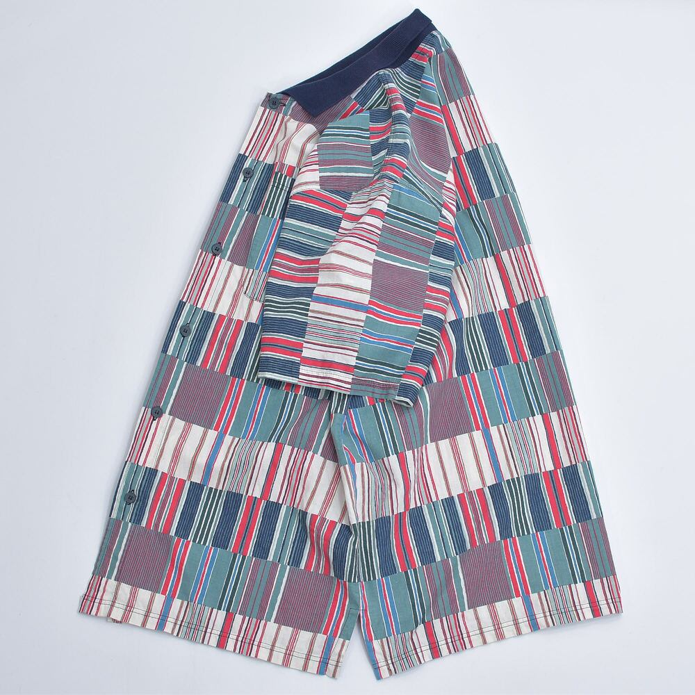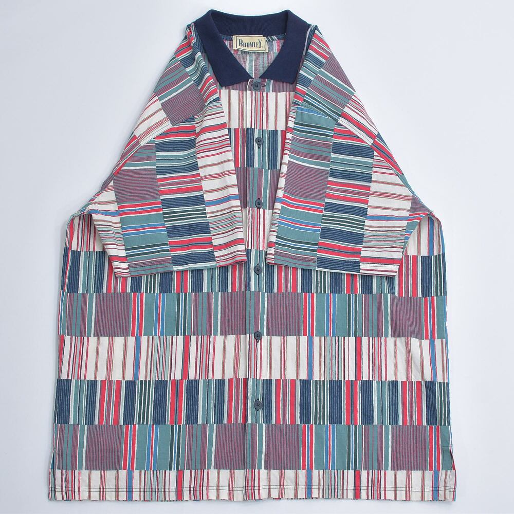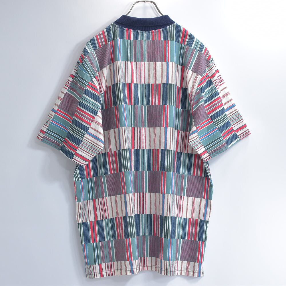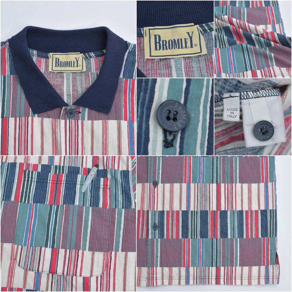 80~90s イタリア製 BROMLEY ブロムリー 襟切替 パッチワーク風 マルチストライプ 総柄 半袖 シャツ マルチカラー ヴィンテージ ブルー ビンテージ ヨーロッパ古着 メンズ XL相当