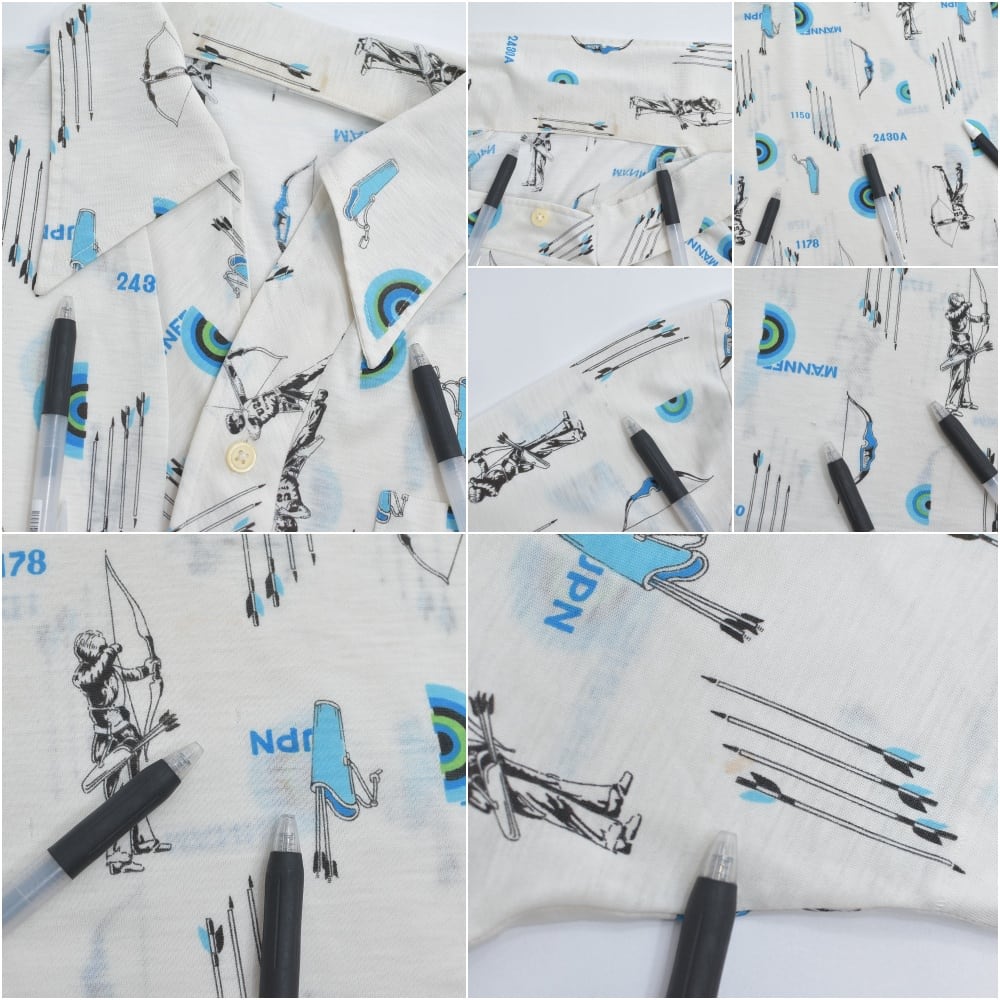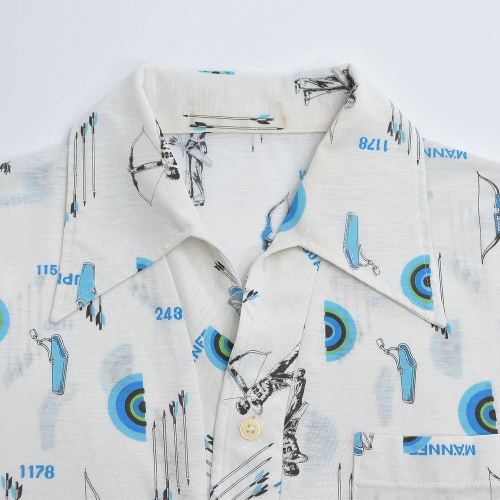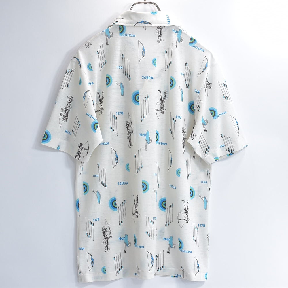 70s~80s アーチェリー 総柄デザイン プリント ポロシャツ プルオーバー シャツ 半袖 ホワイト ヴィンテージ ビンテージ レトロ 古着 メンズ ~M相当
