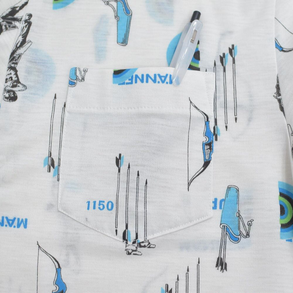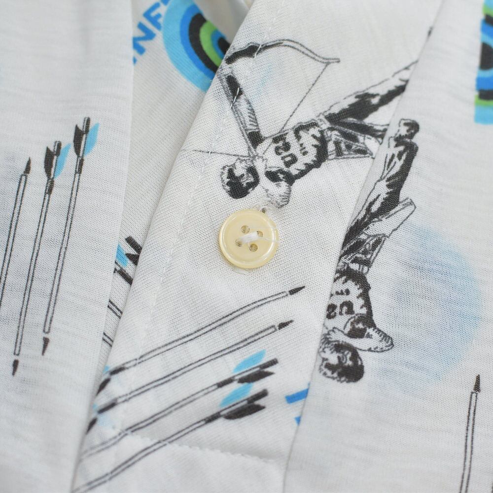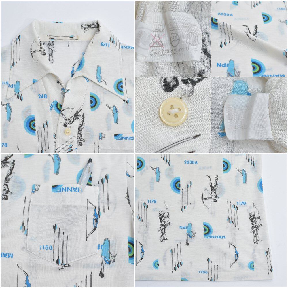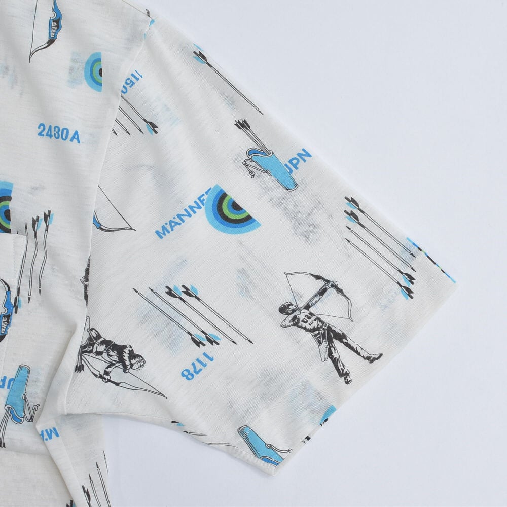 70s~80s アーチェリー 総柄デザイン プリント ポロシャツ プルオーバー シャツ 半袖 ホワイト ヴィンテージ ビンテージ レトロ 古着 メンズ ~M相当