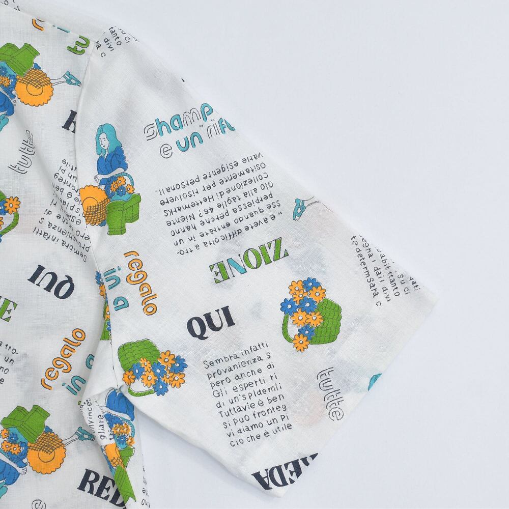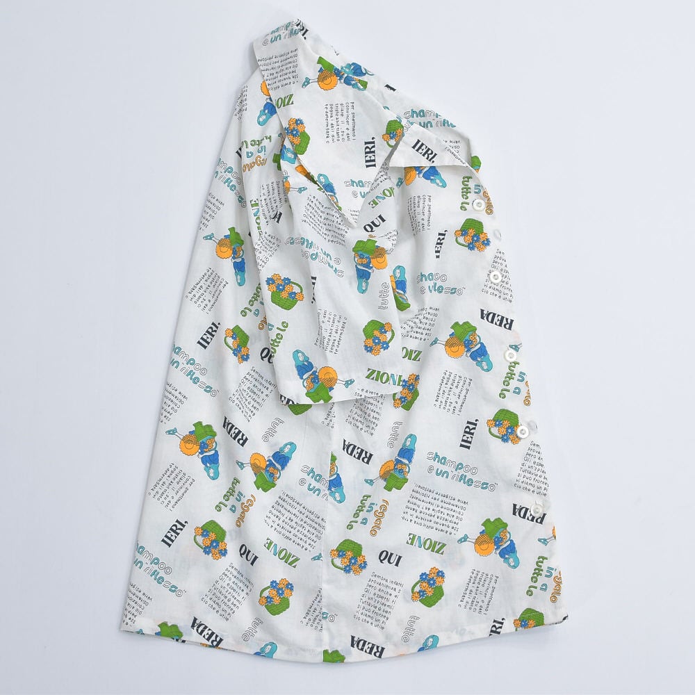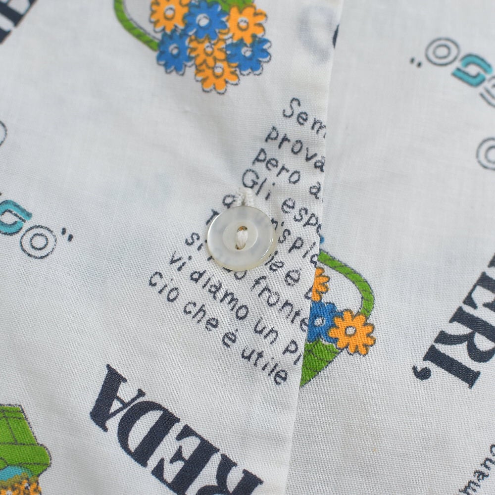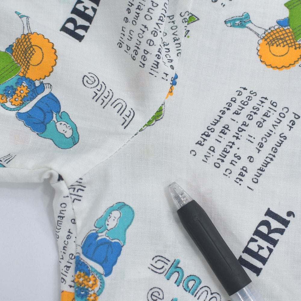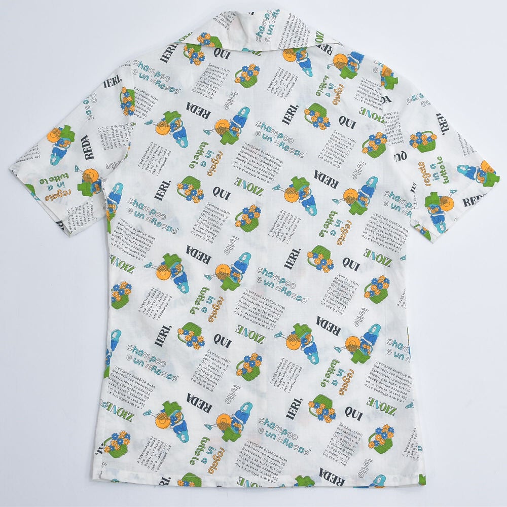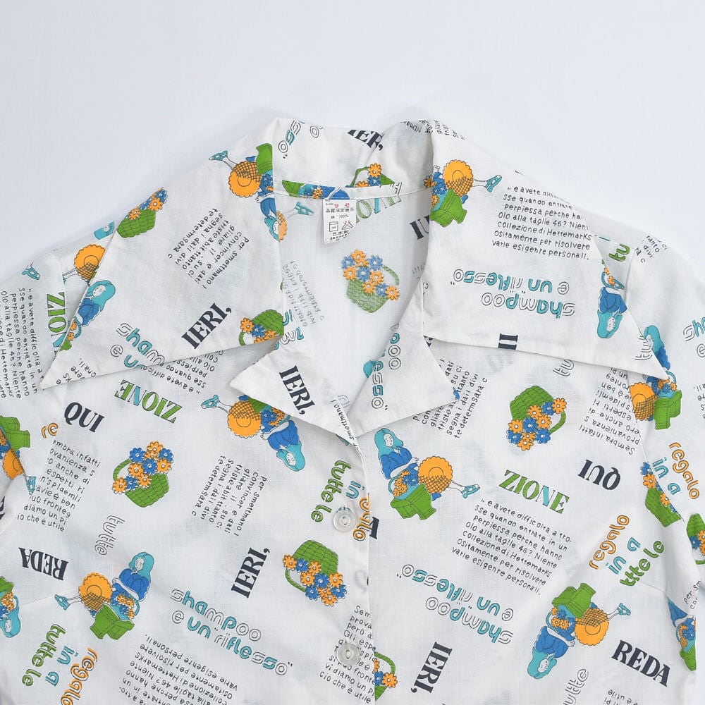 70s~ 日本製 昭和レトロ イラスト 総柄デザイン 半袖 コットンシャツ ホワイト ヴィンテージ ジャパンビンテージ レトロ 古着 レディースXS相当