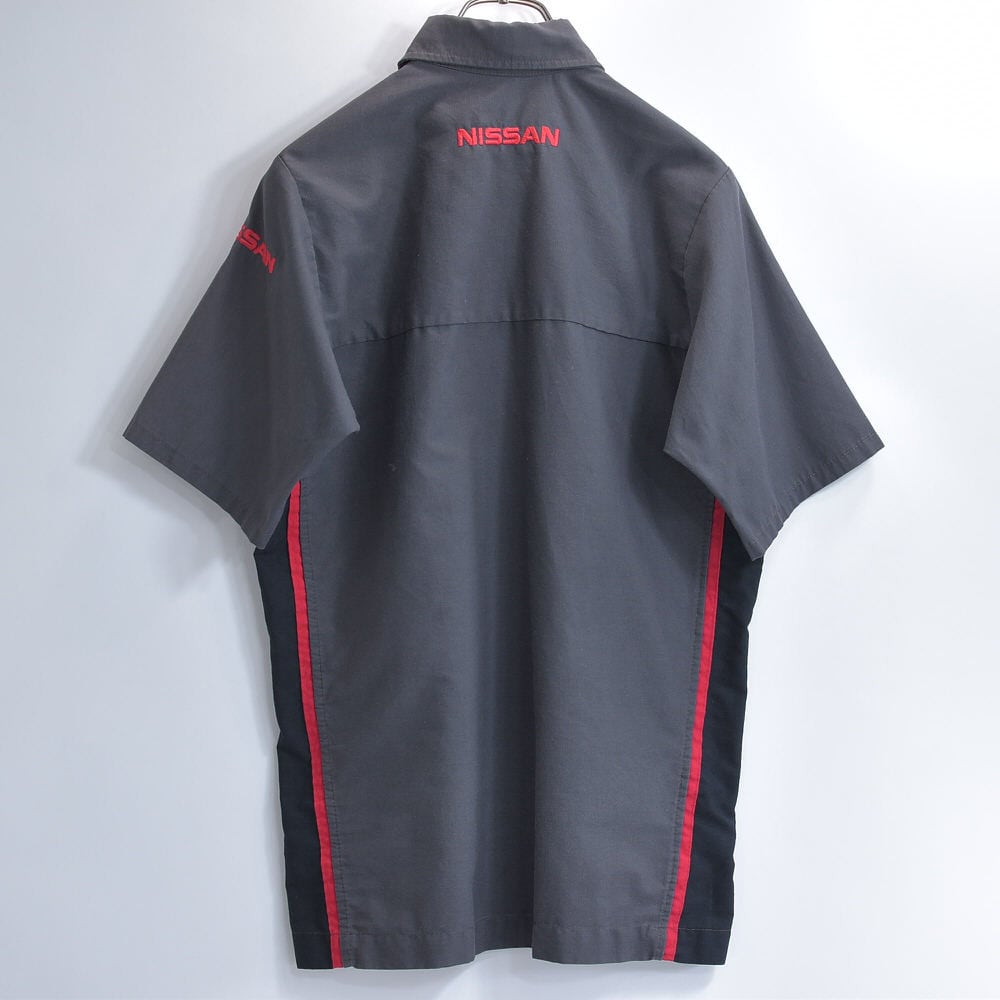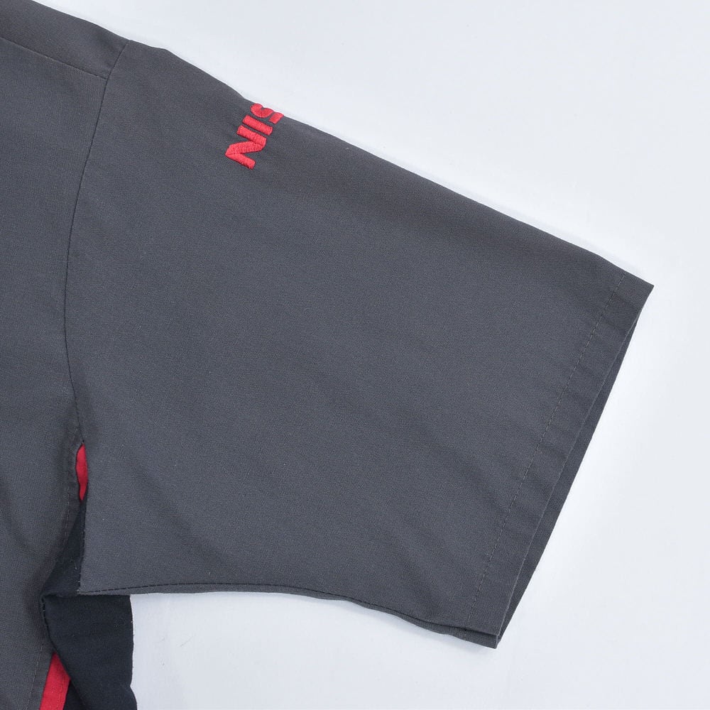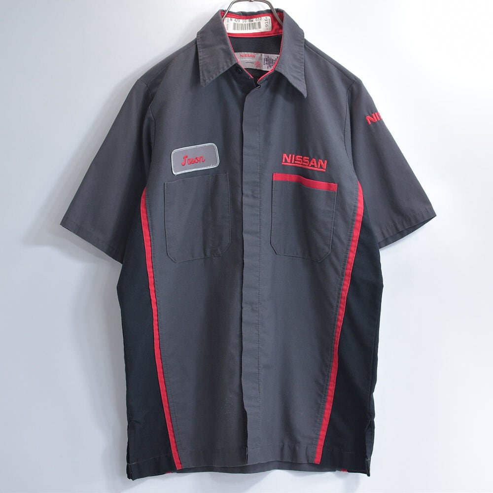 00s RED KAP レッドキャップ NISSAN ワークシャツ ワッペン 刺繍入り 半袖 シャツ 切替デザイン グレー ブラック レッド 日産 自動車 作業服 ヴィンテージ ビンテージ アメリカ古着 メンズ Sサイズ