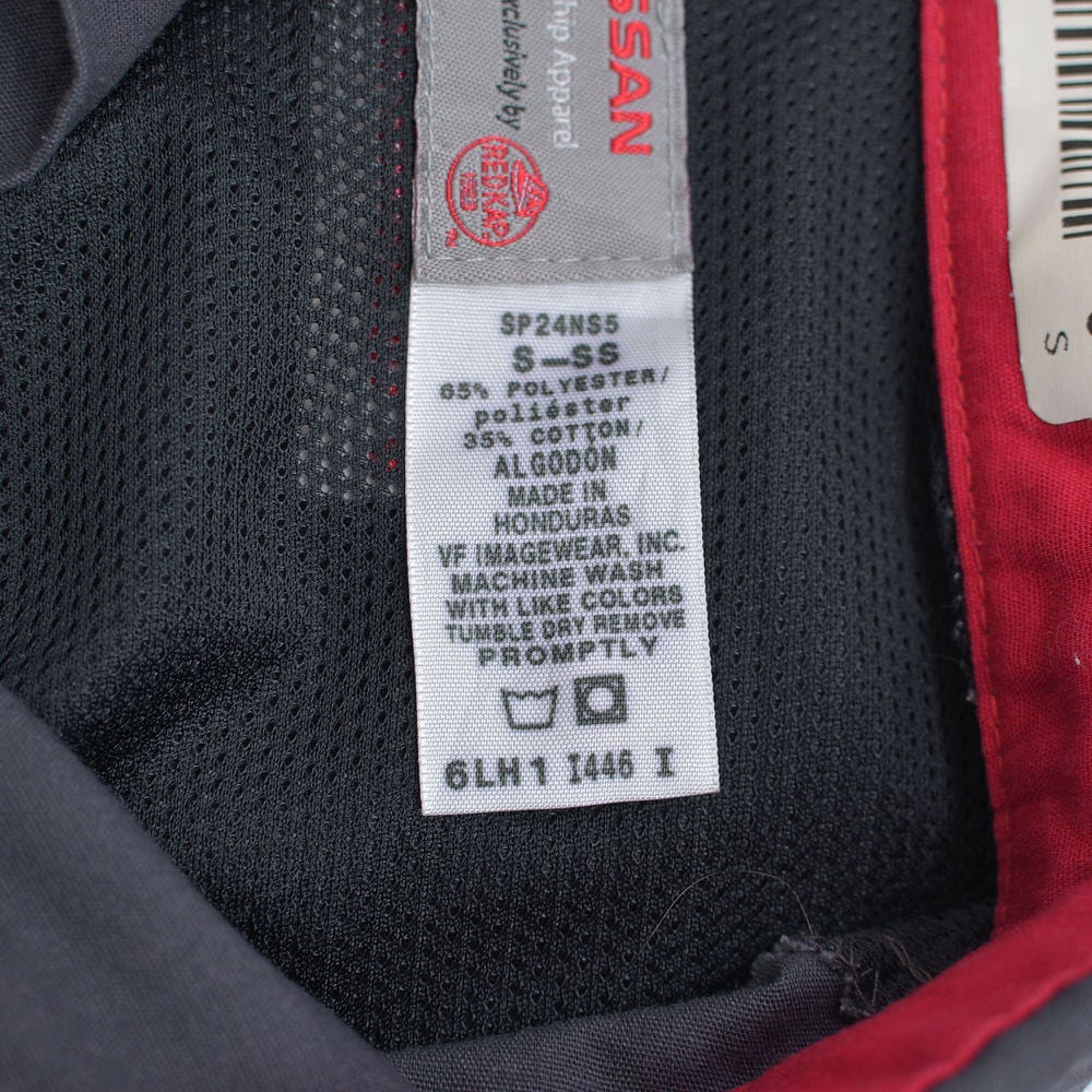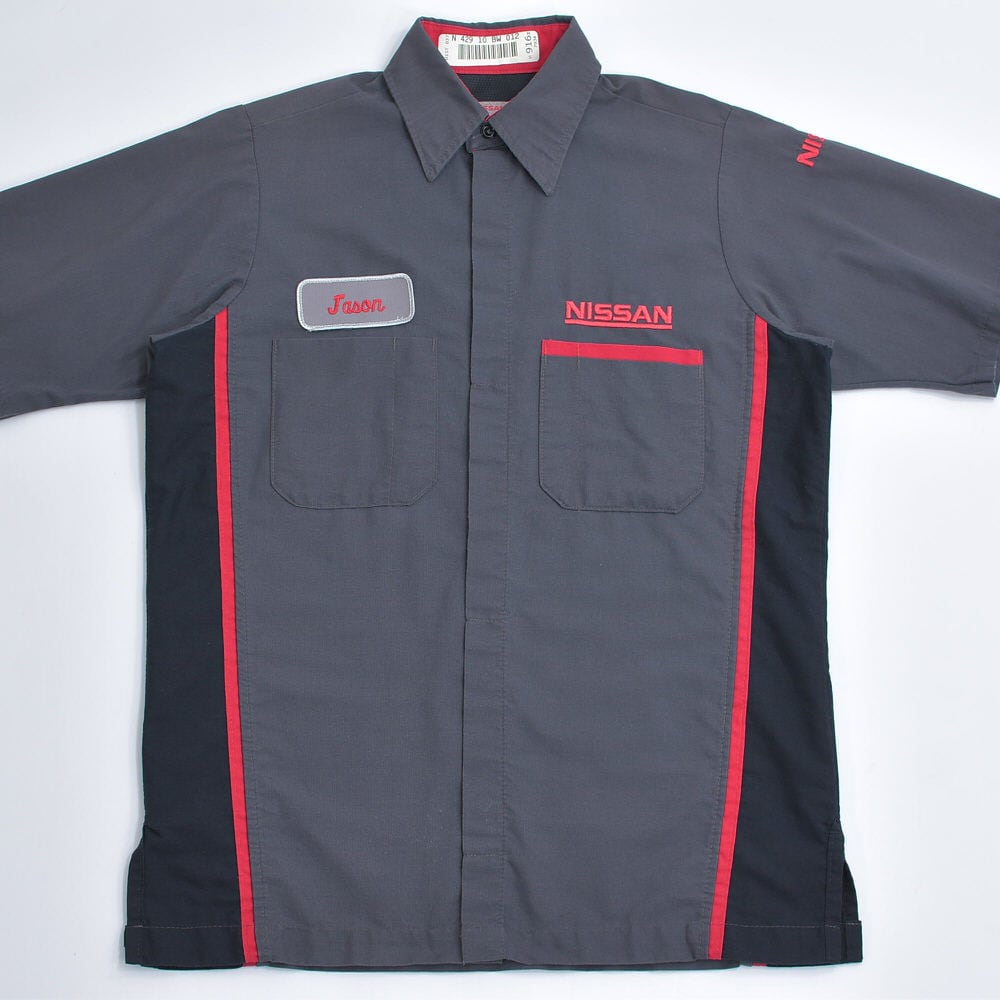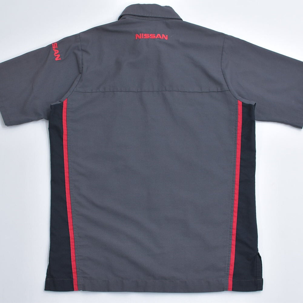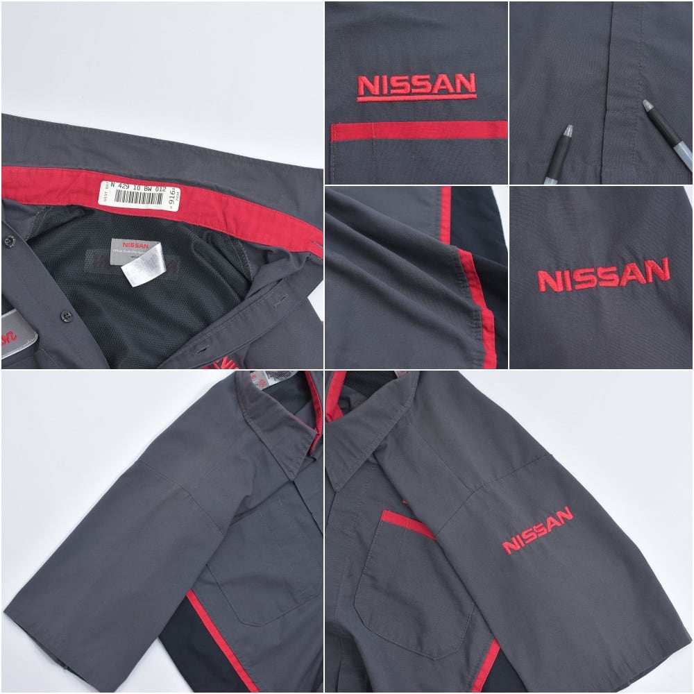 00s RED KAP レッドキャップ NISSAN ワークシャツ ワッペン 刺繍入り 半袖 シャツ 切替デザイン グレー ブラック レッド 日産 自動車 作業服 ヴィンテージ ビンテージ アメリカ古着 メンズ Sサイズ