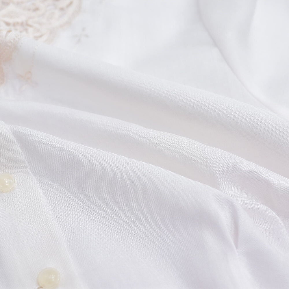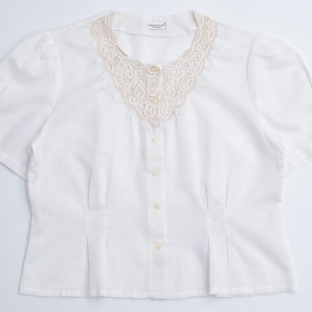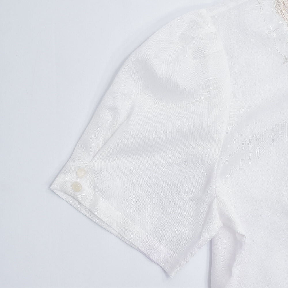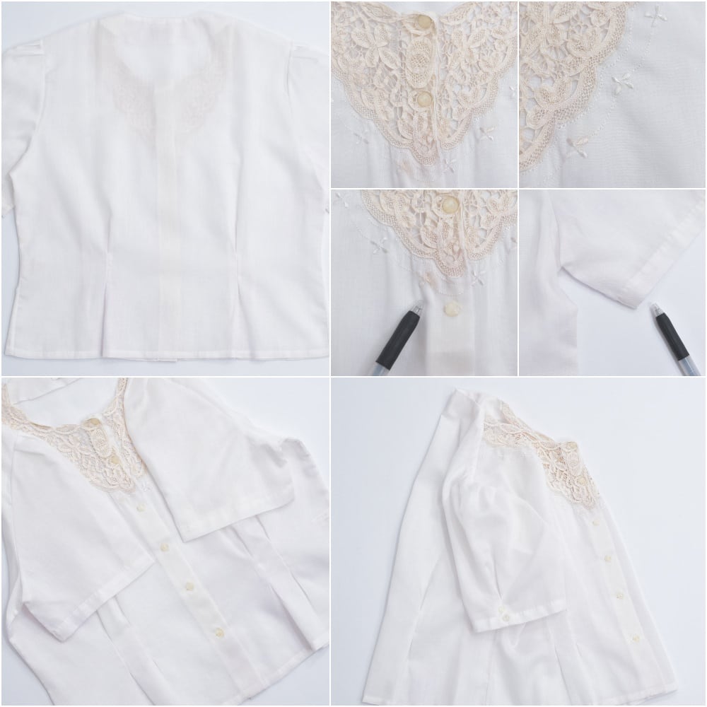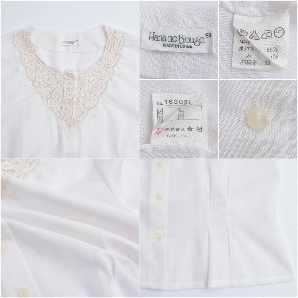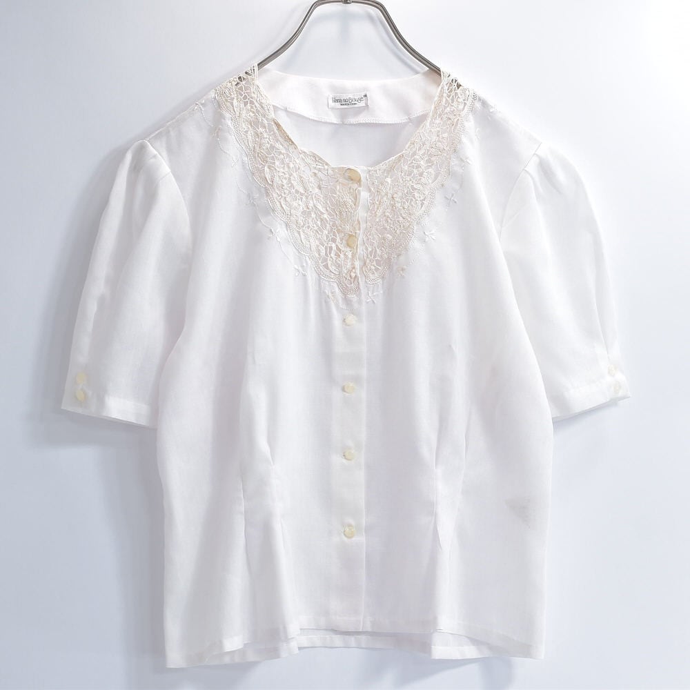 90s~ Hana no Blouse ハナノブラウス 刺繍入り レース切替 パフスリーブ 半袖 ブラウス デザインシャツ オフホワイト ベージュ ヴィンテージ ビンテージ レトロ 古着 レディース XS相当