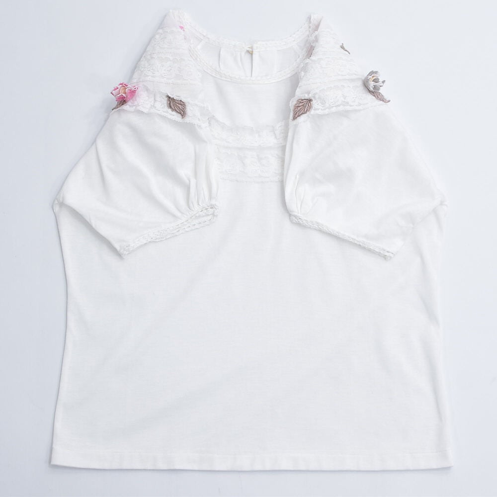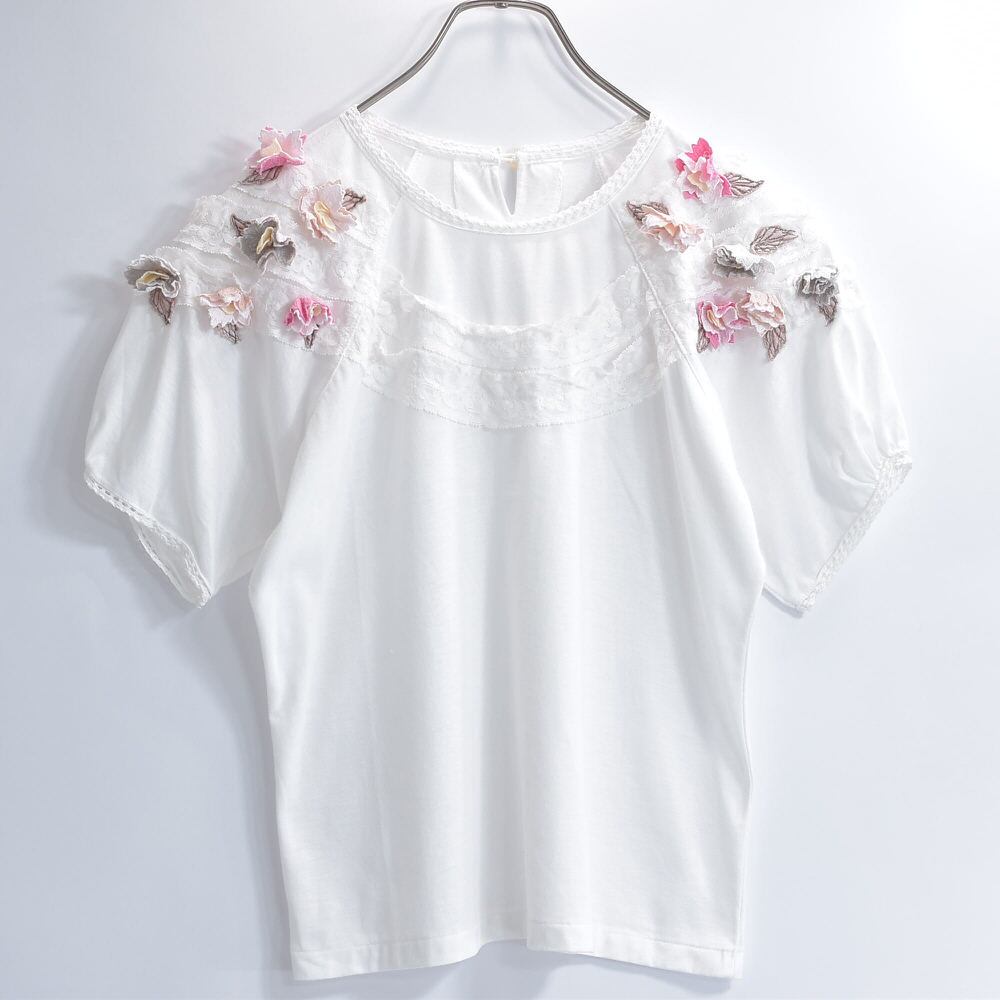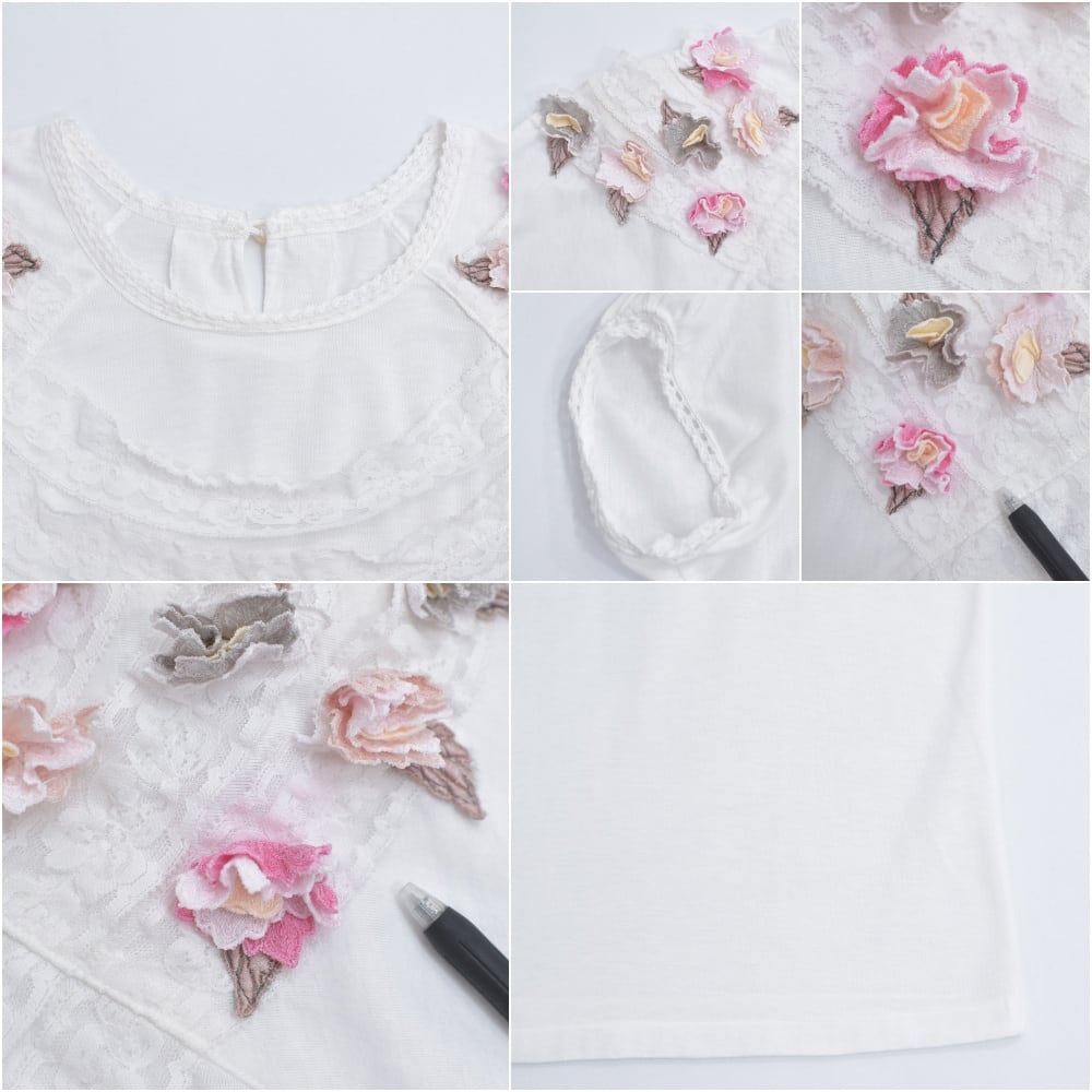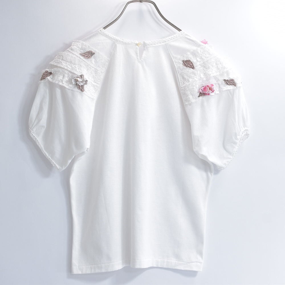 Used 3Dフラワーモチーフ 立体 花刺繍 レース使い パフスリーブ カットソー ファンシー レトロ Tシャツ ホワイト ヴィンテージ ビンテージ 古着 レディース サイズ相当