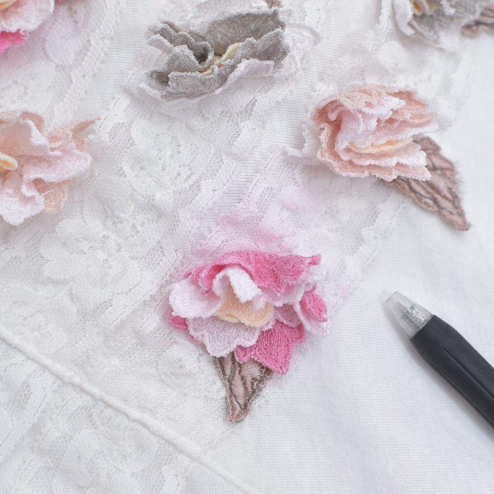 肩先にちょこんと咲いた、砂糖菓子みたいな色の花々