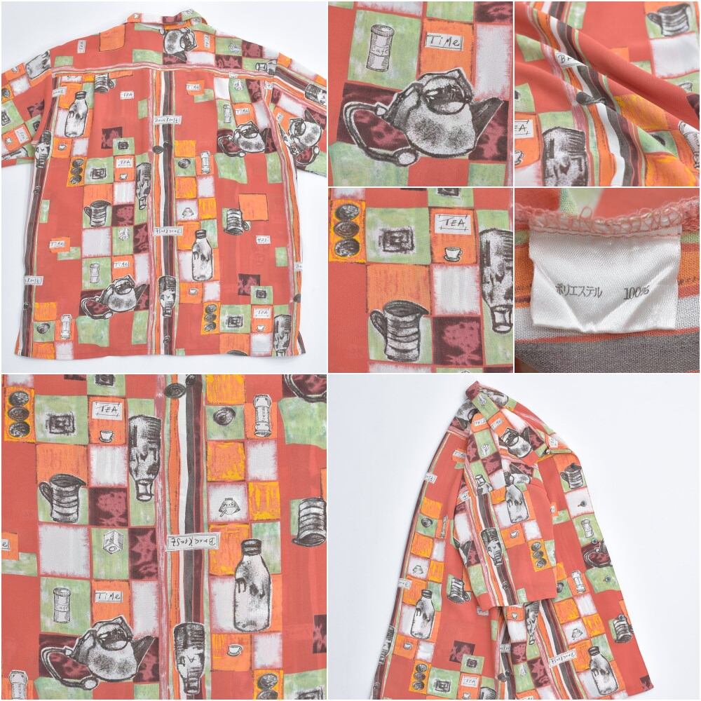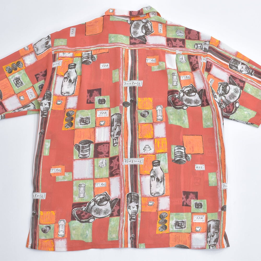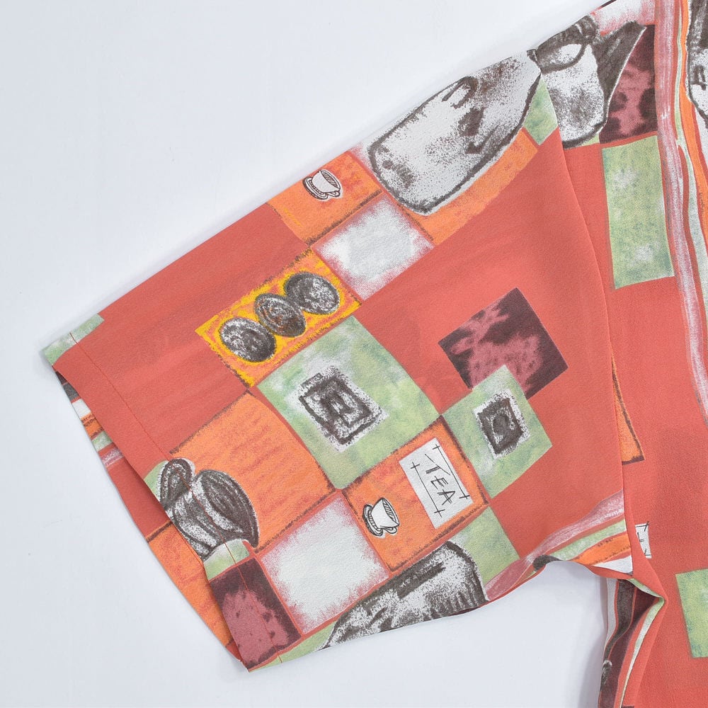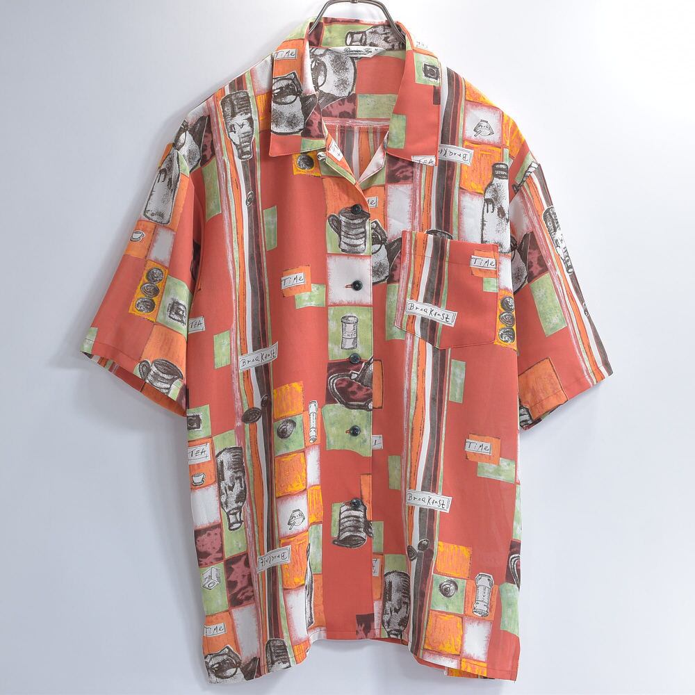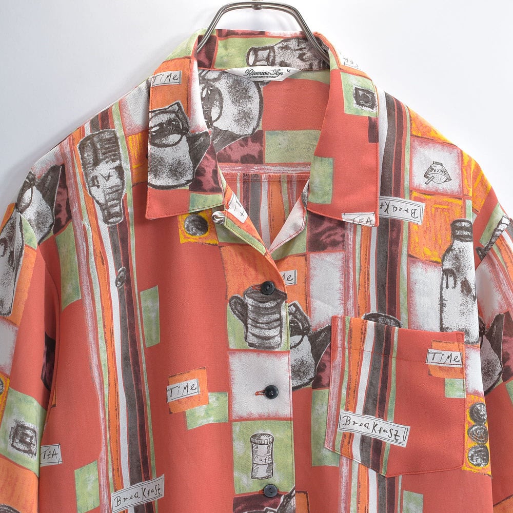 90s~ 日本製 Riverina Top リベリナトップ 総柄 アートデザイン オープンカラー 半袖シャツ ブレックファスト カフェ 開襟 ポリシャツ ヴィンテージ オレンジ ジャパンビンテージ 古着 レディースL相当