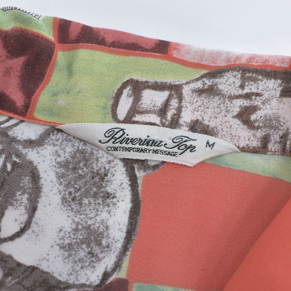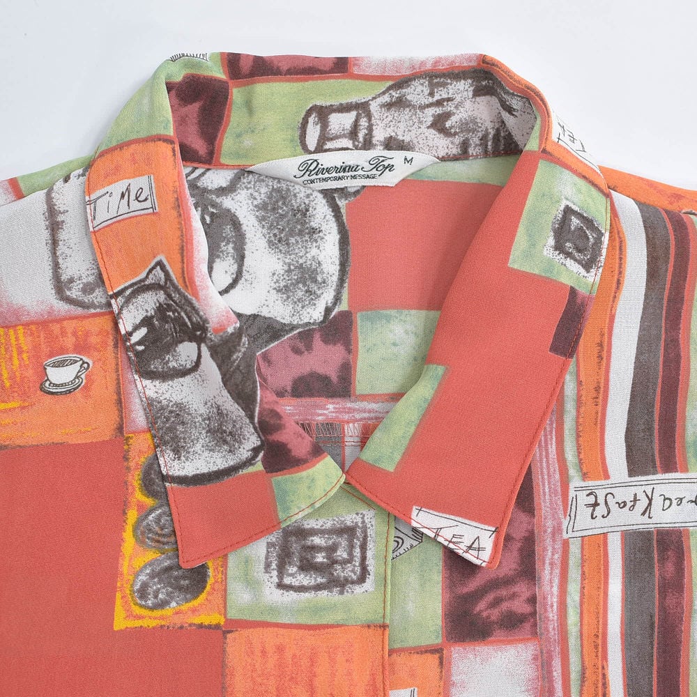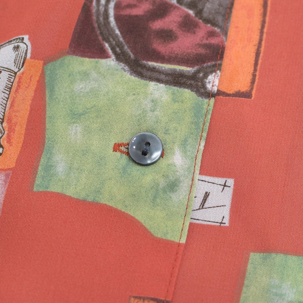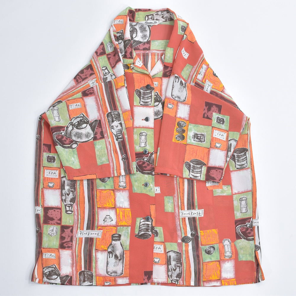 90s~ 日本製 Riverina Top リベリナトップ 総柄 アートデザイン オープンカラー 半袖シャツ ブレックファスト カフェ 開襟 ポリシャツ ヴィンテージ オレンジ ジャパンビンテージ 古着 レディースL相当