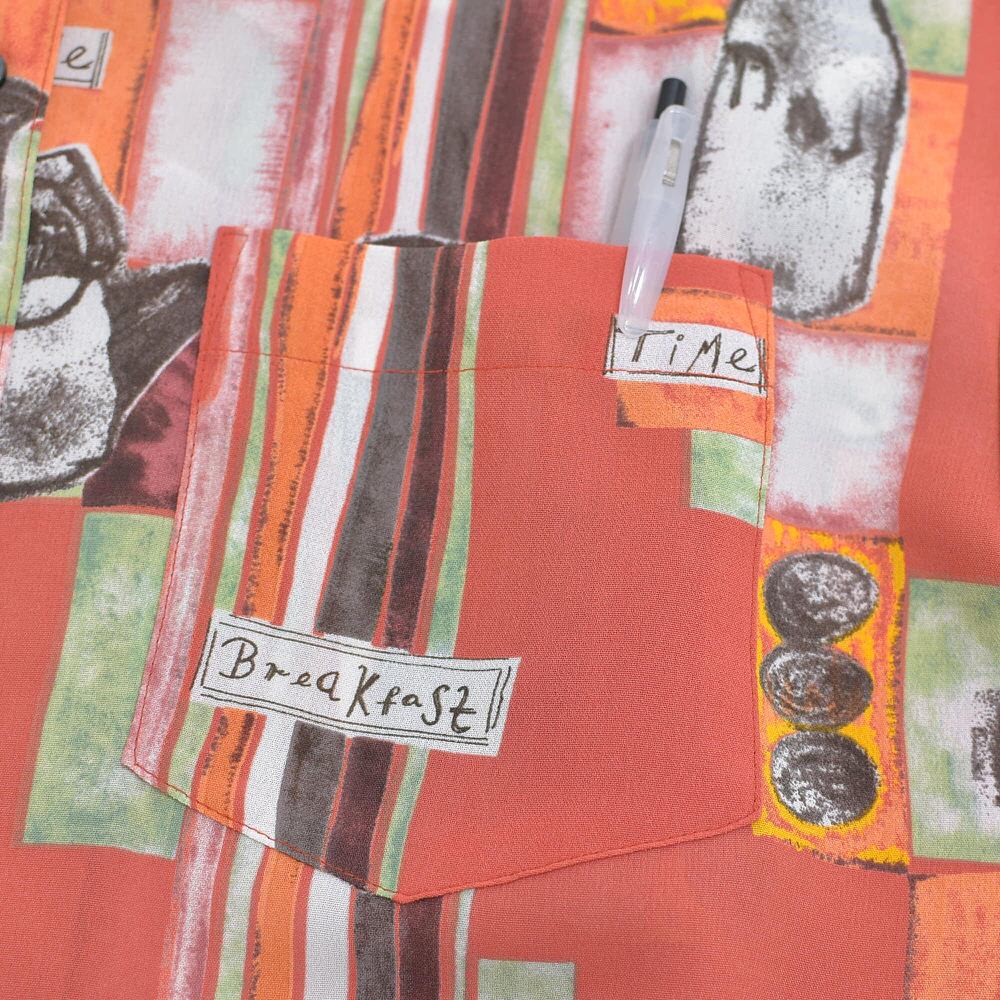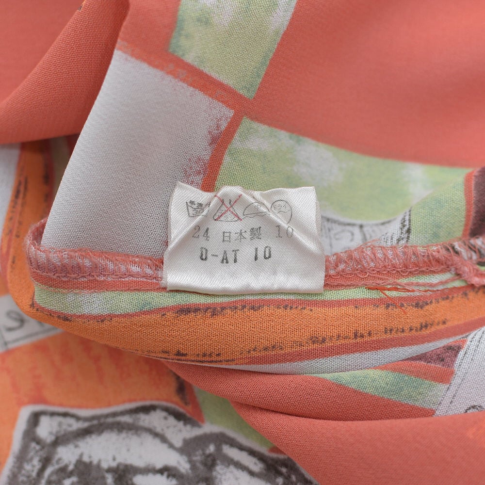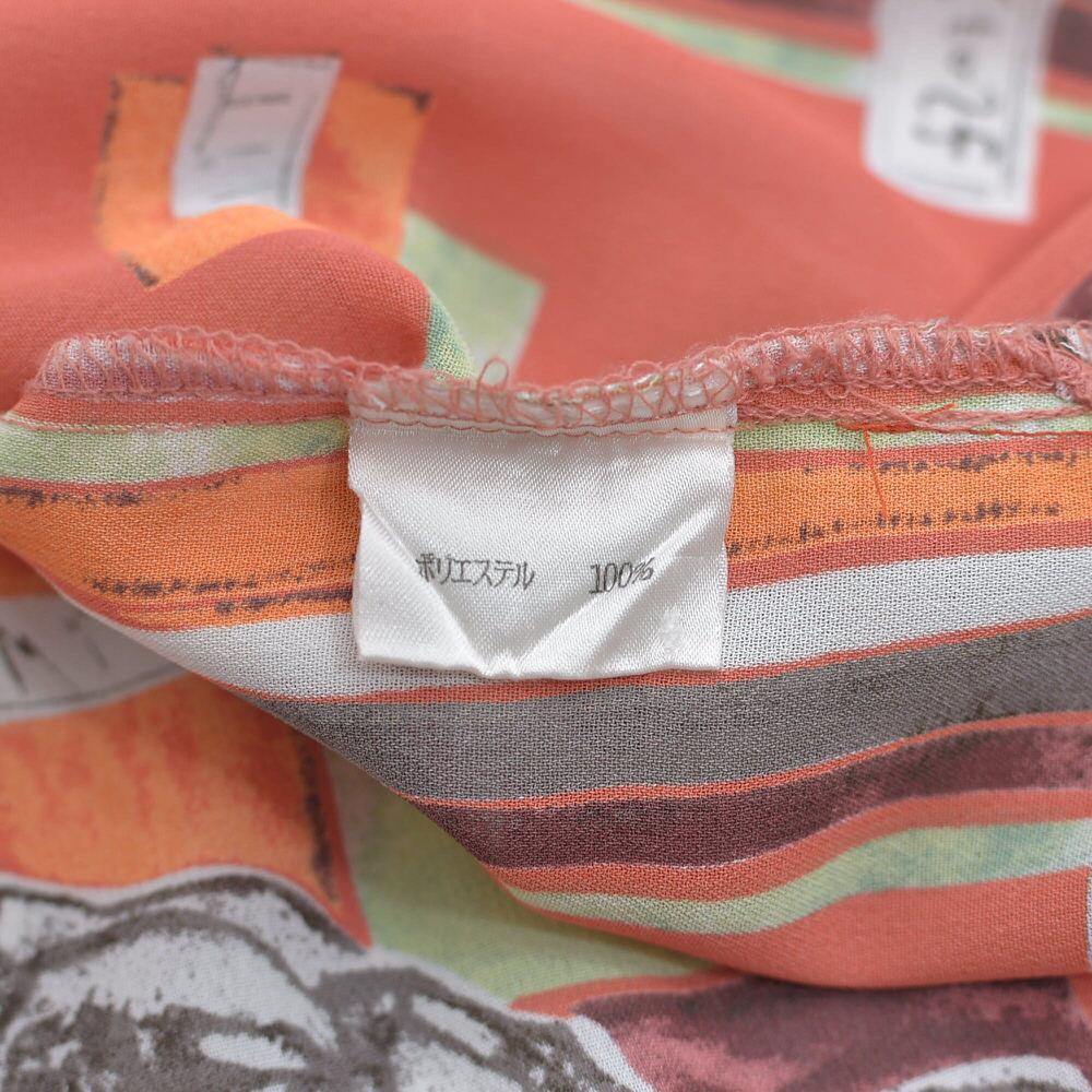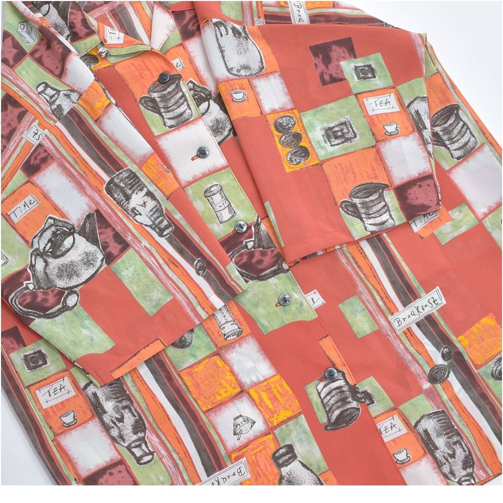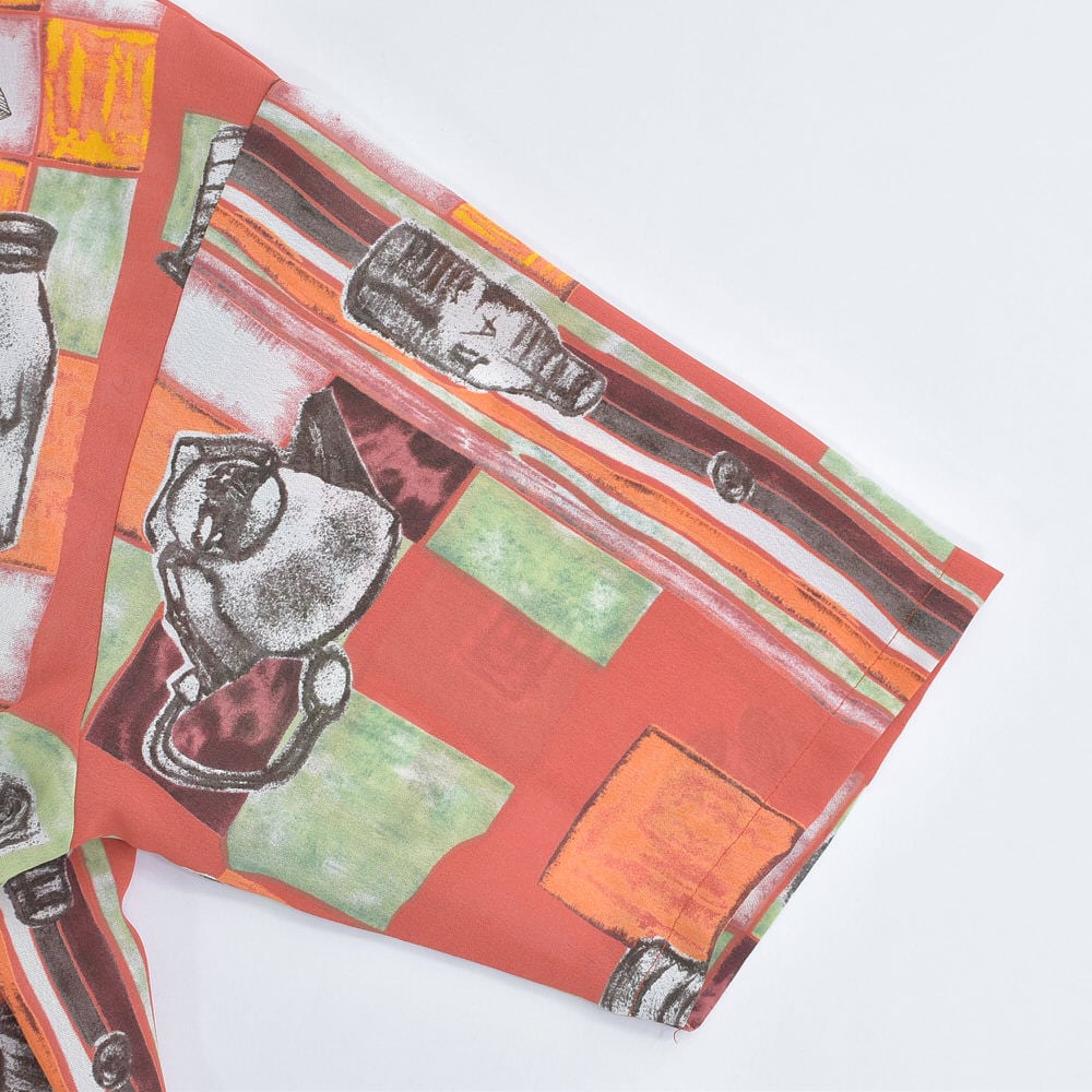 90s~ 日本製 Riverina Top リベリナトップ 総柄 アートデザイン オープンカラー 半袖シャツ ブレックファスト カフェ 開襟 ポリシャツ ヴィンテージ オレンジ ジャパンビンテージ 古着 レディースL相当