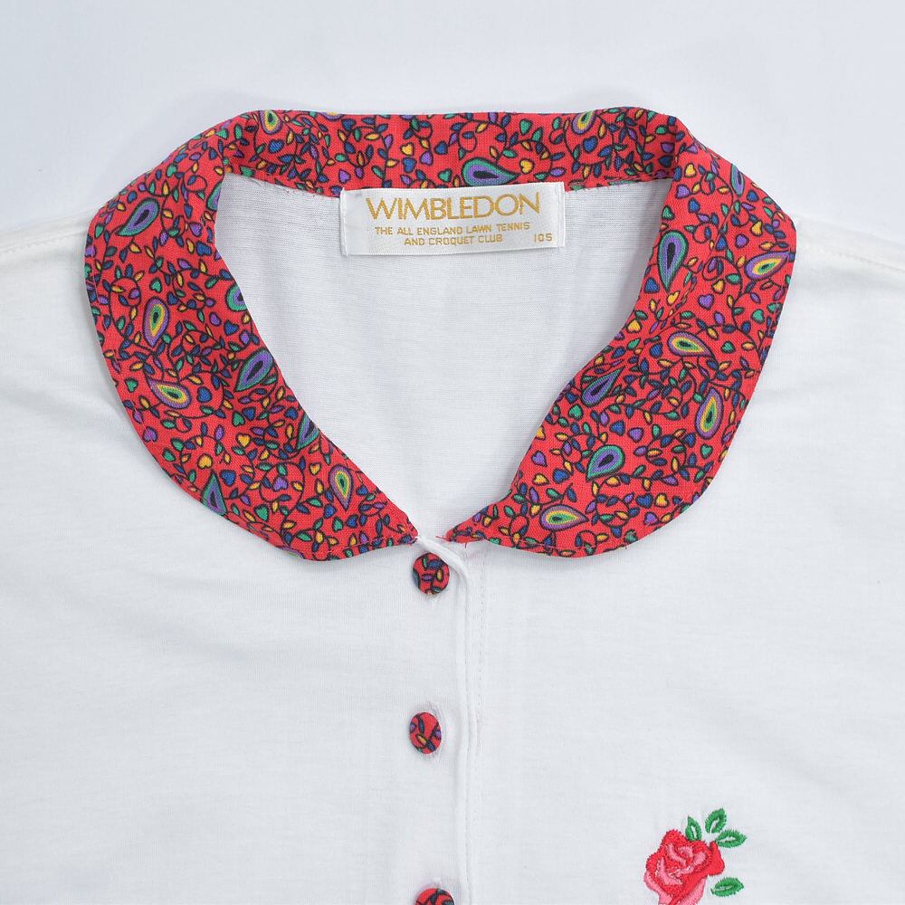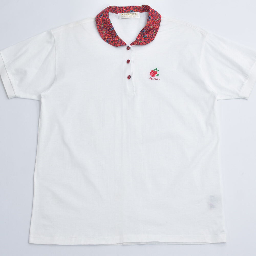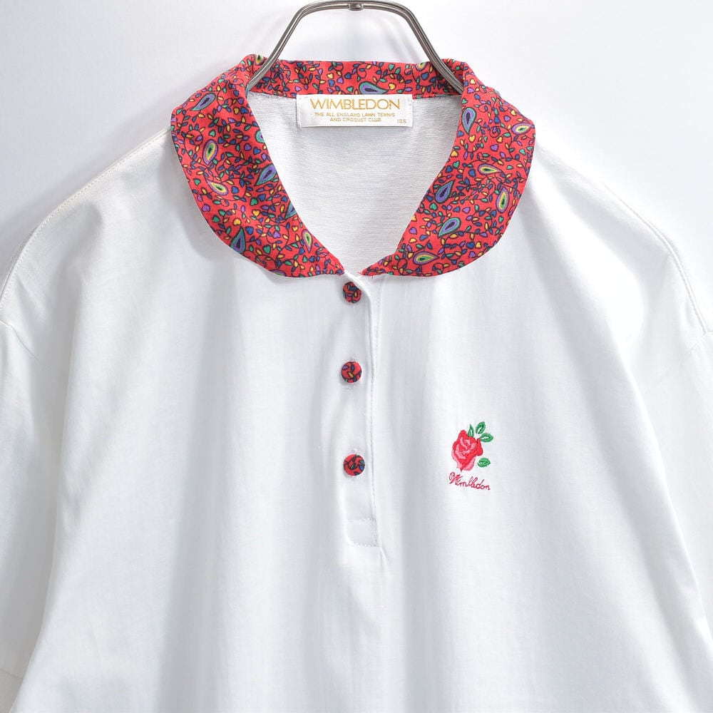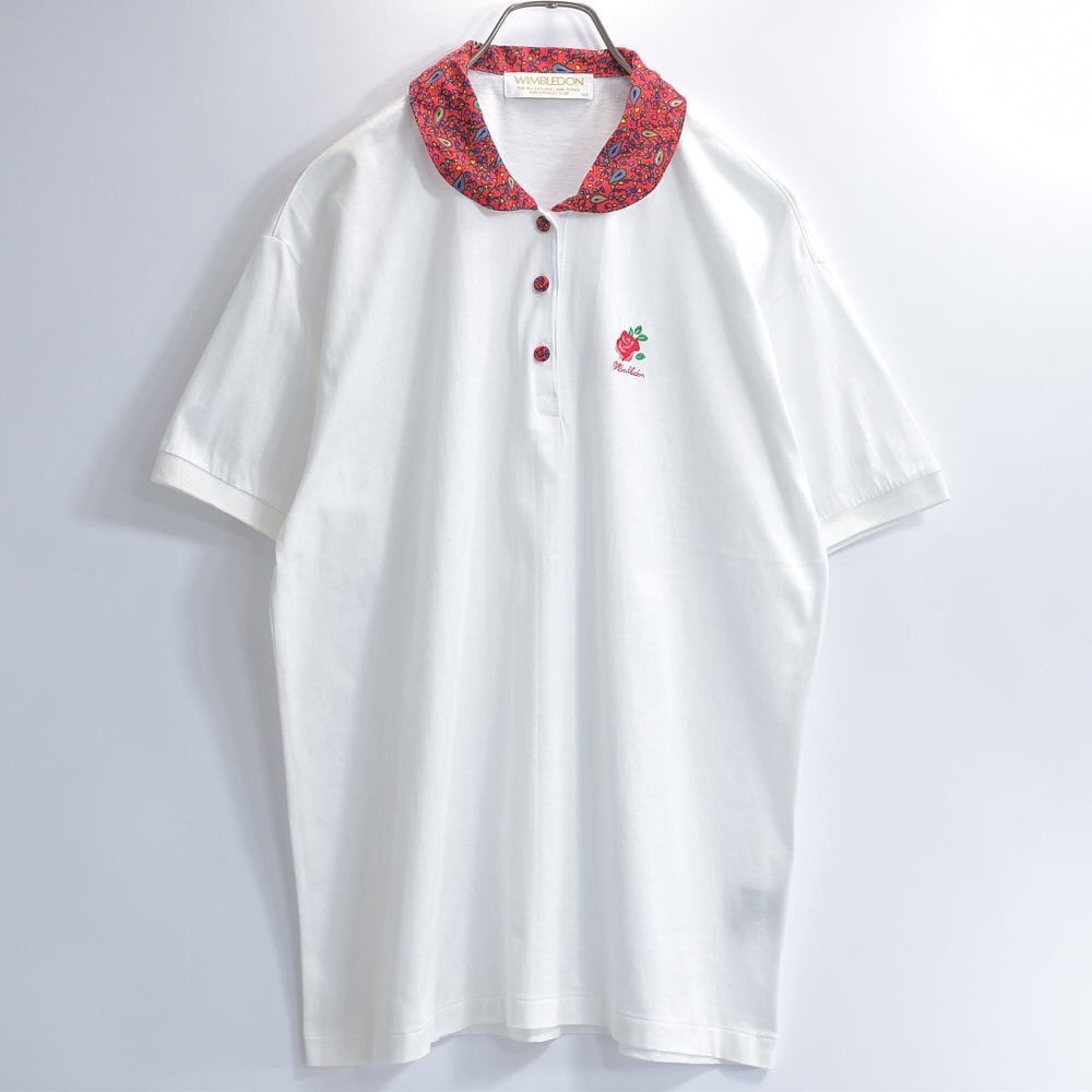 90s~ WIMBLEDON ウィンブルドン ペイズリー柄 襟切替デザイン 刺繍入り ポロシャツ ローズ 薔薇 テニスウェア ホワイト レッド ヴィンテージ ビンテージ 古着 レディース L相当